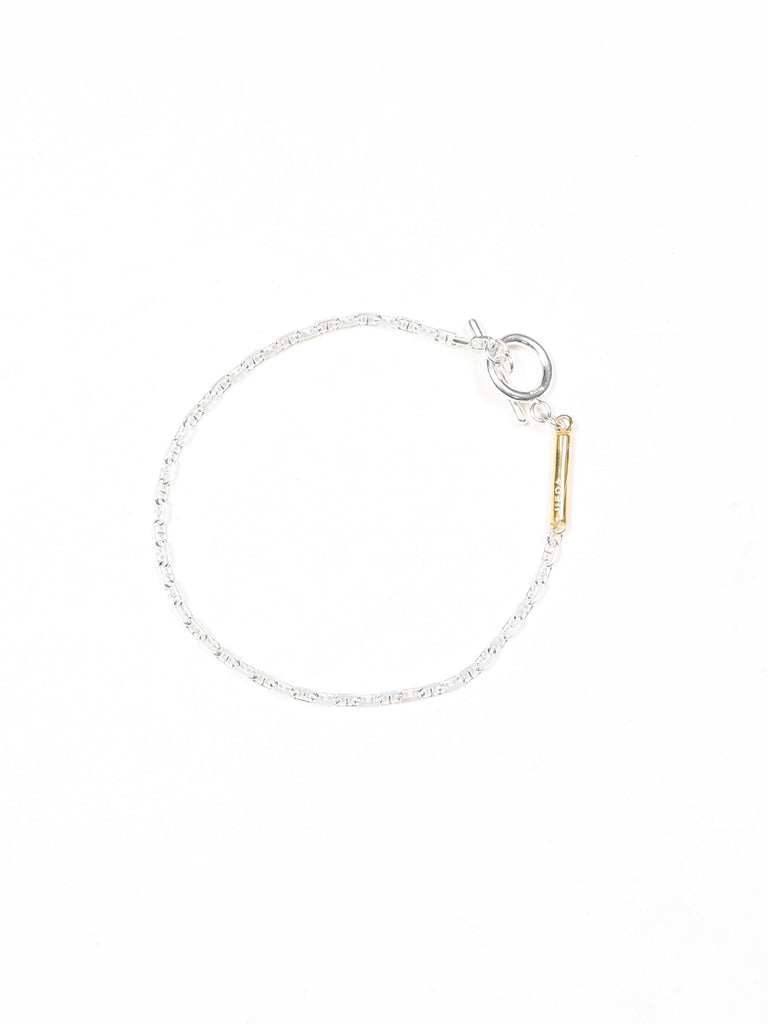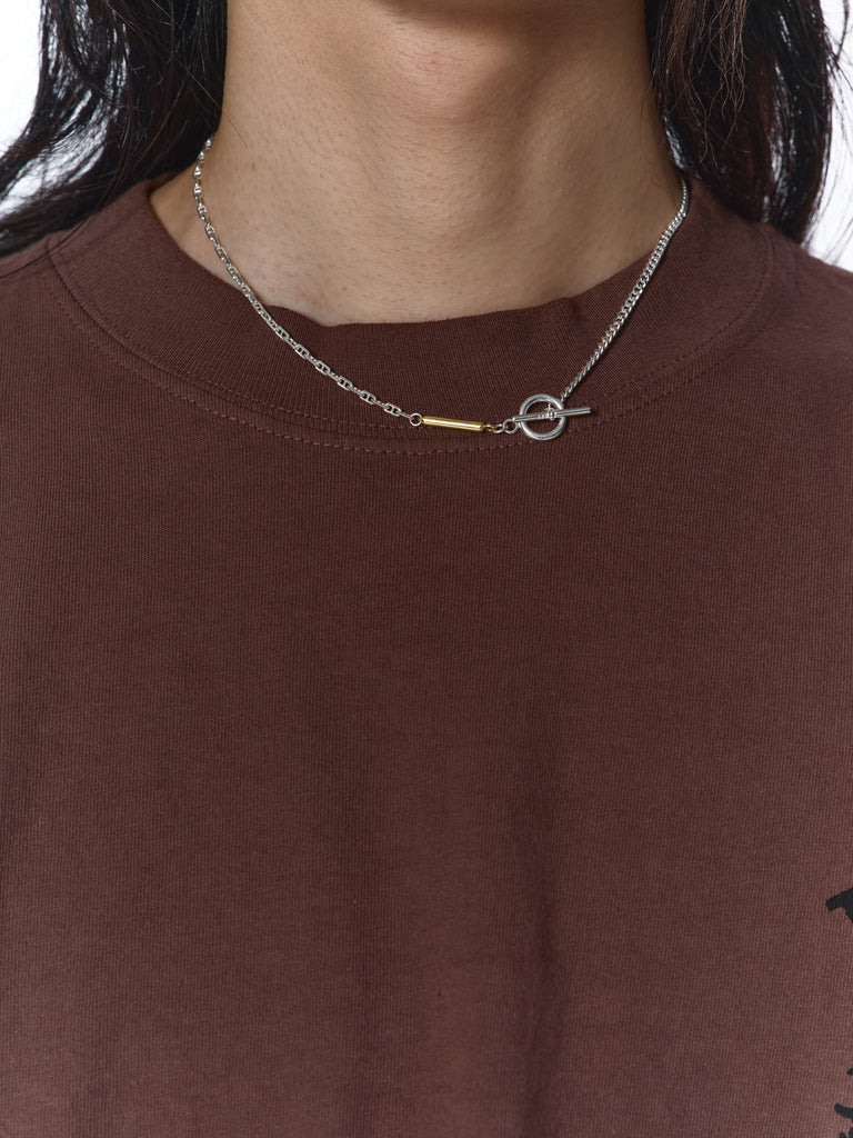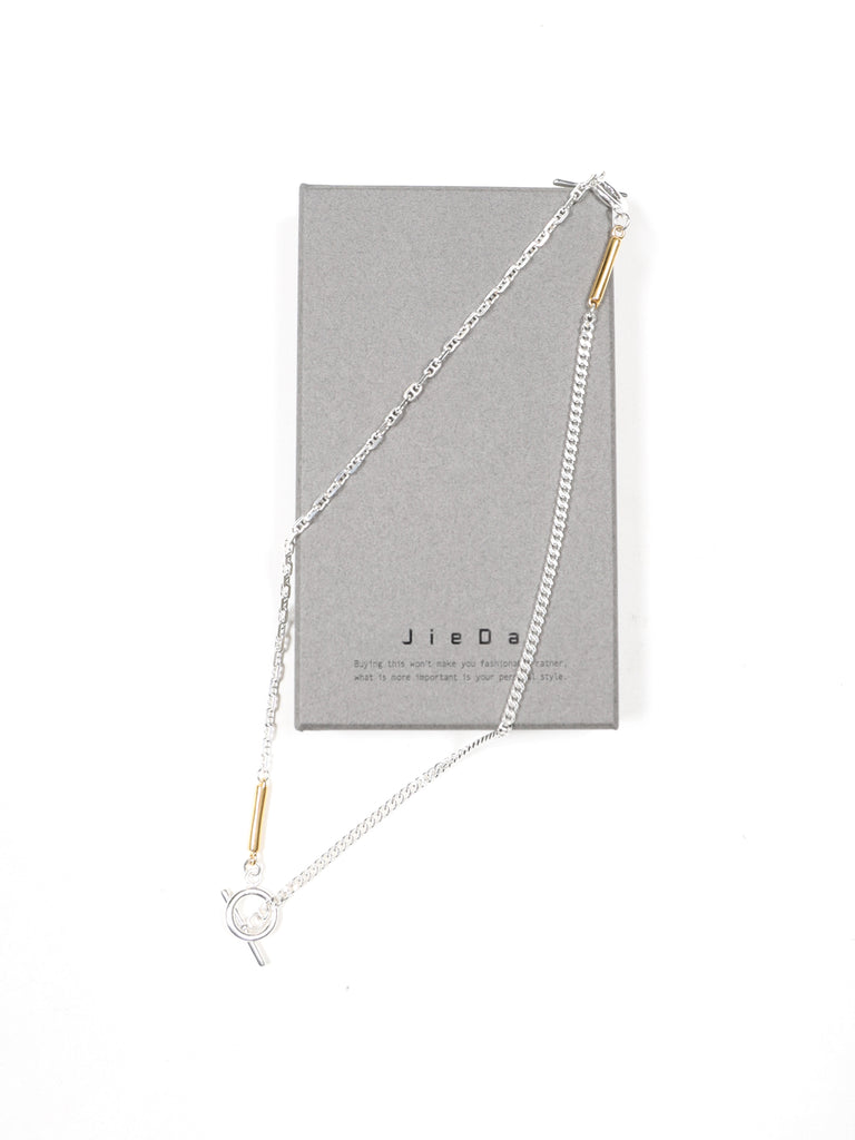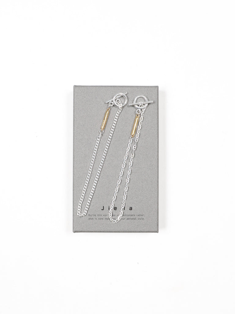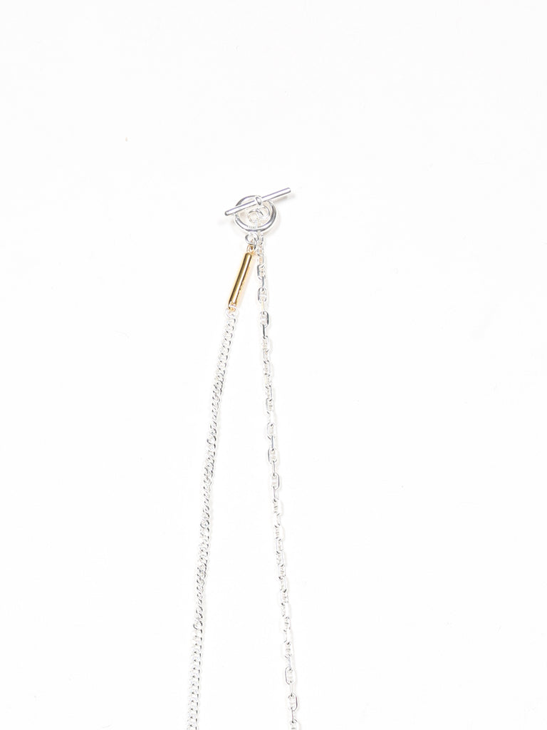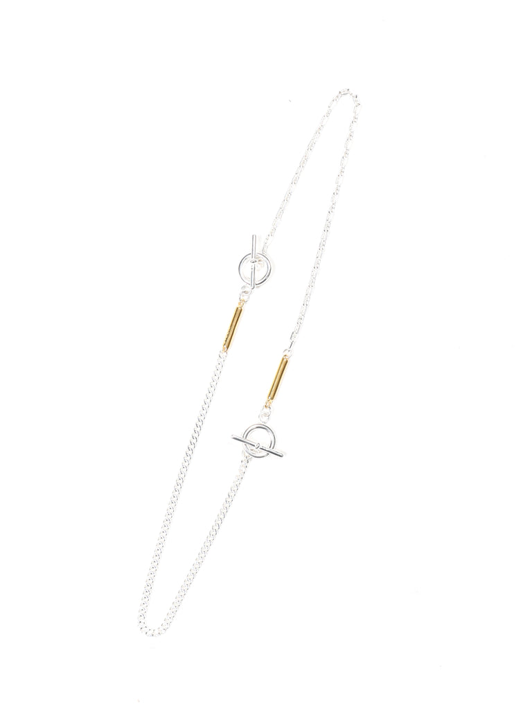 2つのチェーンをミックスさせるとネックレスに、外して使うと2連のブレスレットになります。