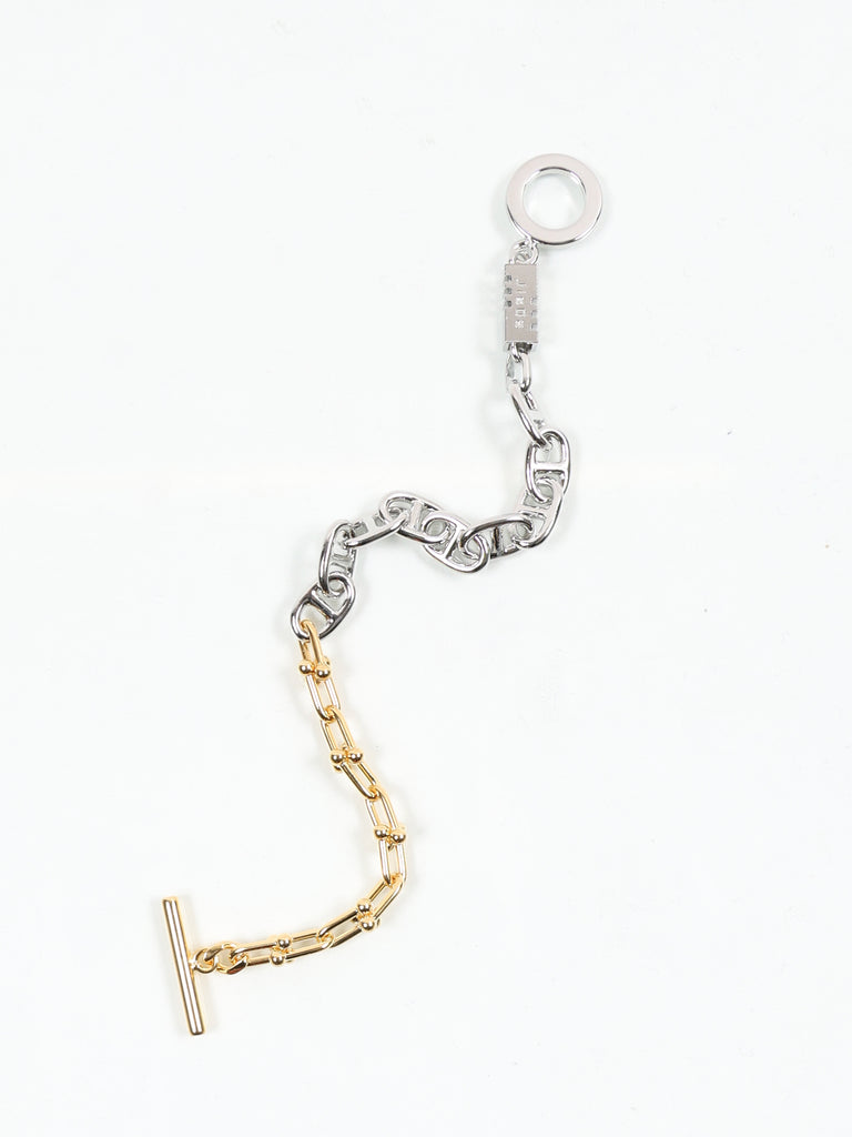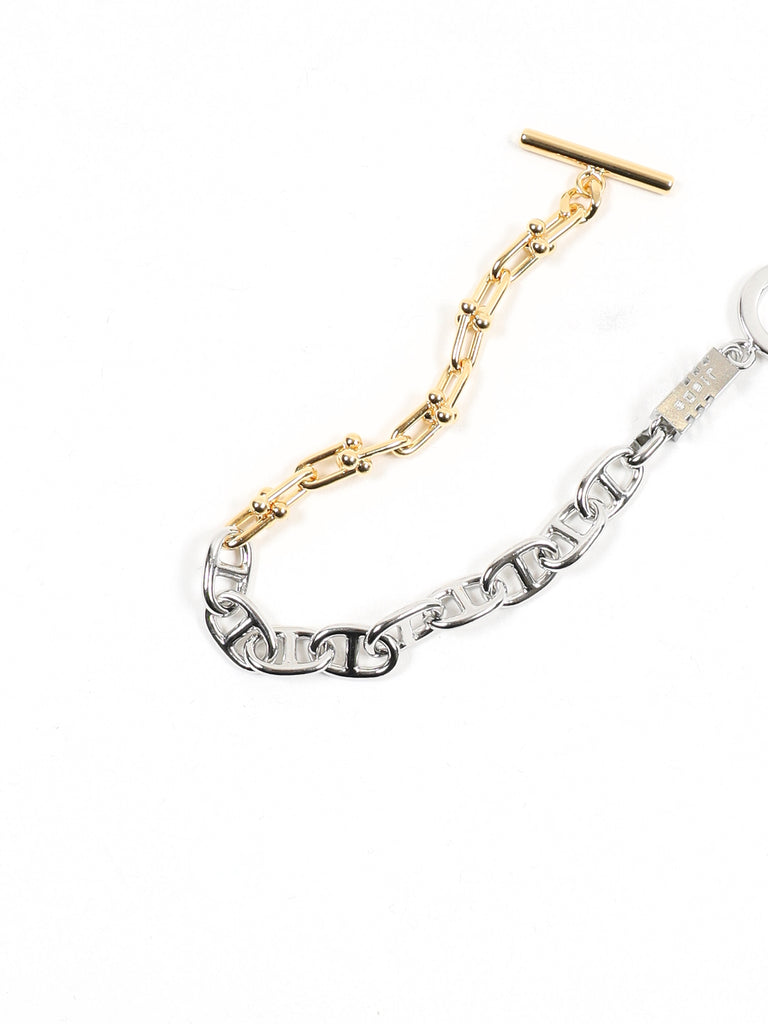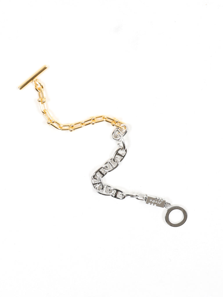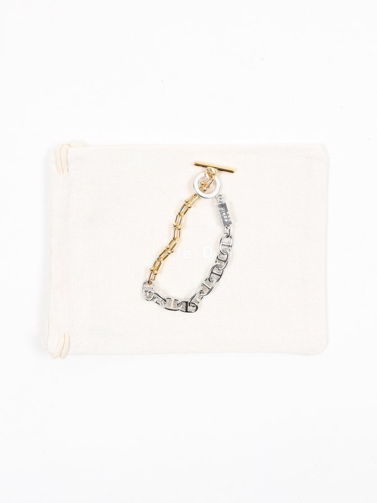 マンテルタイプの留め具を採用したため着脱もしやすく、ブランドロゴのネームパーツを組み込んだブレスレットとなっております。