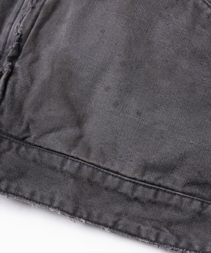生地には表面に砂や圧縮空気を吹き付けて、あえて傷つけアタリ・色落ちを作った後、バイオウォッシュ,ダメージ加工よりヴィンテージのような風合いに仕上げております。