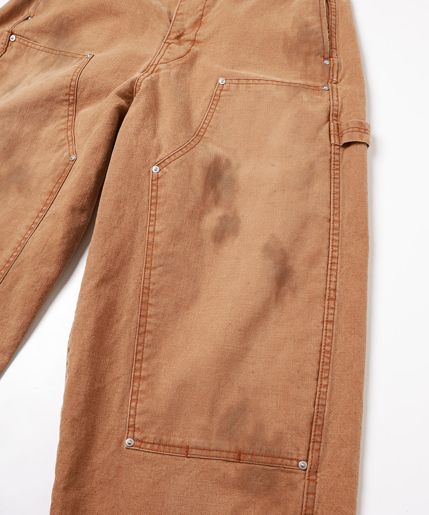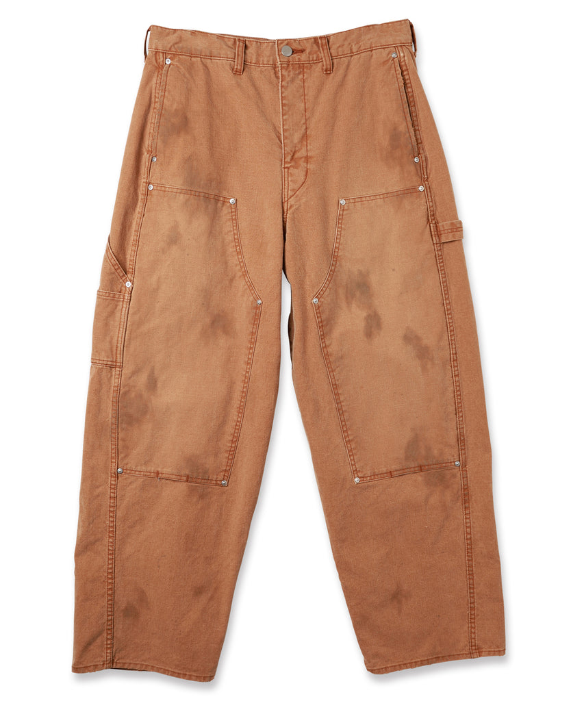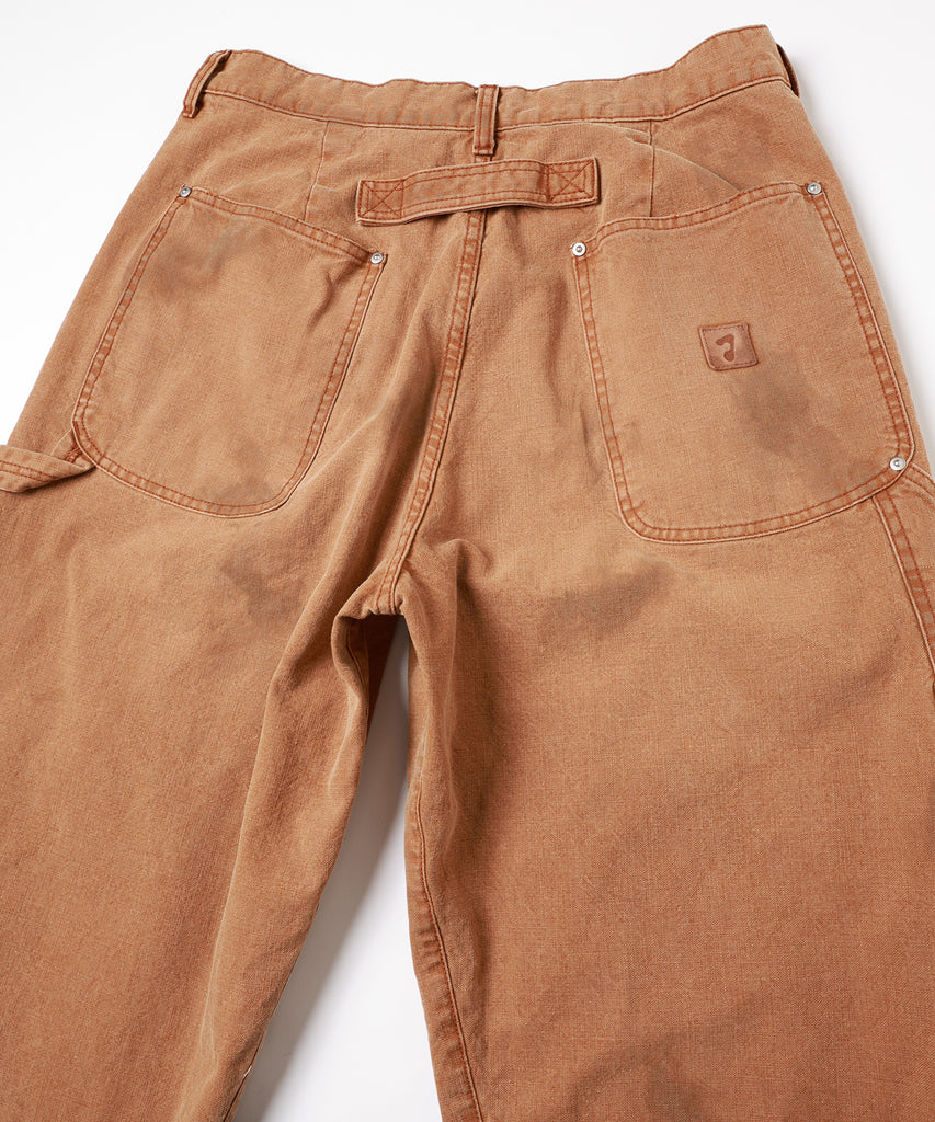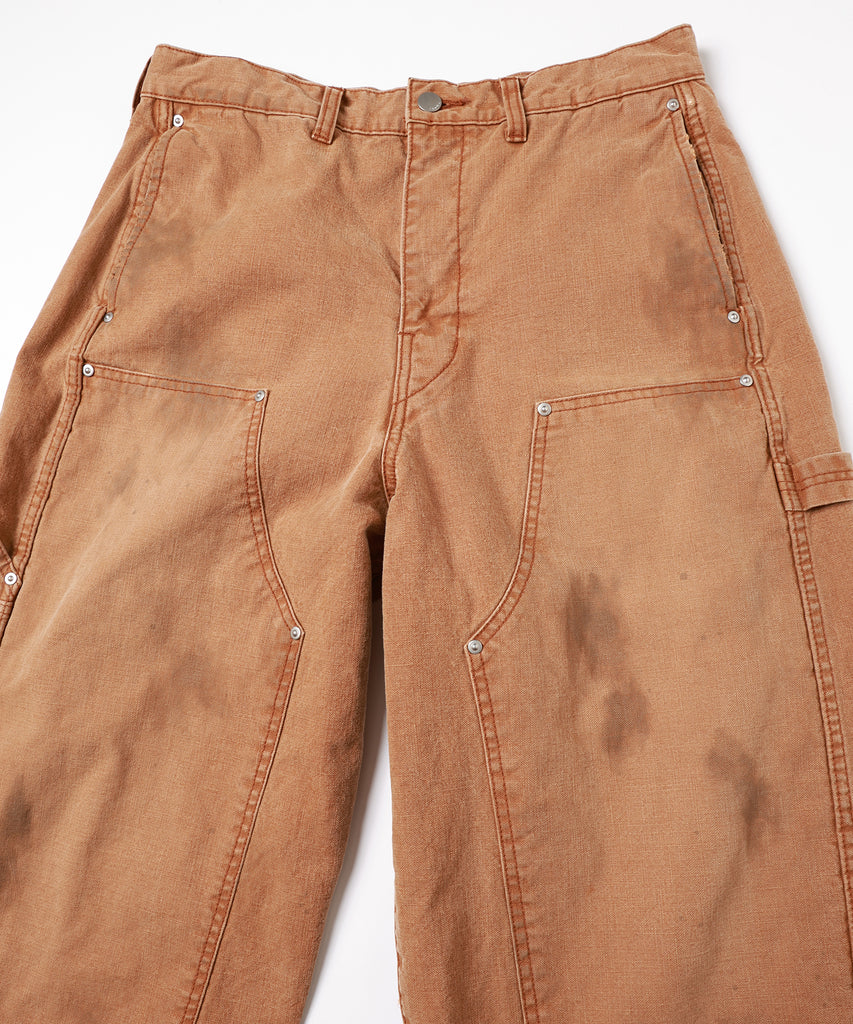 ダブルニー、ツールポケット、ハンマーループ、ダブルステッチといったワークウェアで見られるディテールを入れ、フロントや後ポケットなどに打たれたリベットがデザインのアクセントになっております。