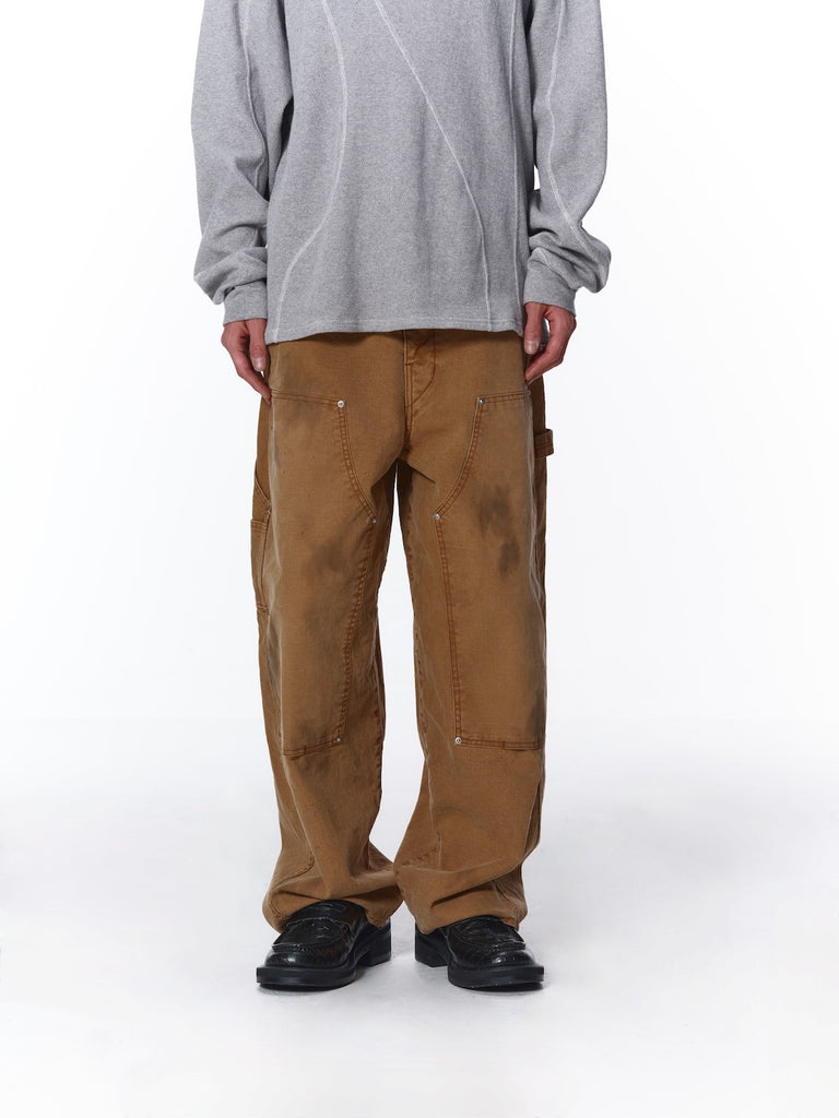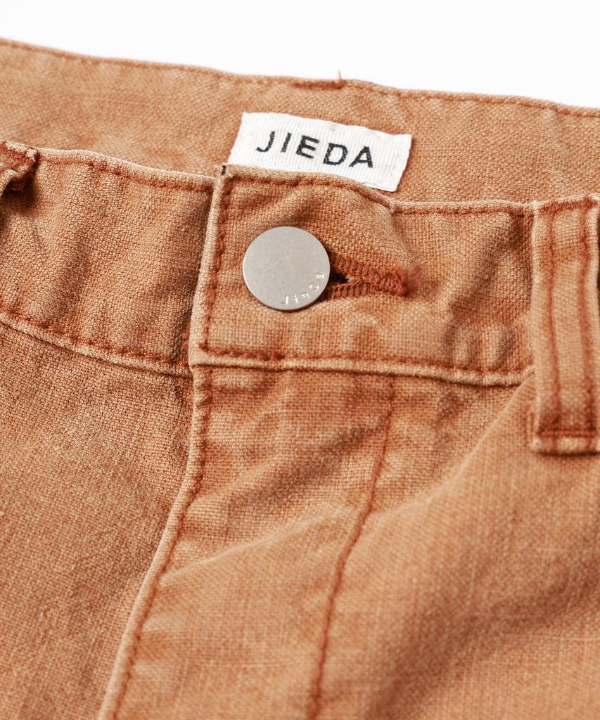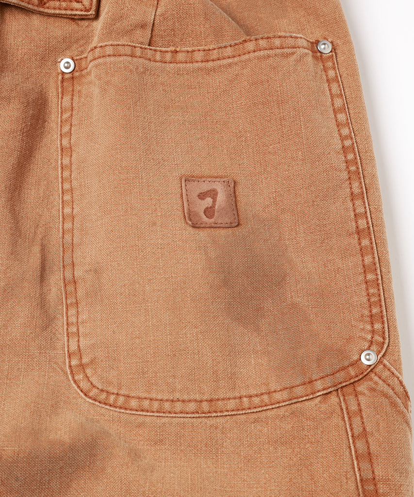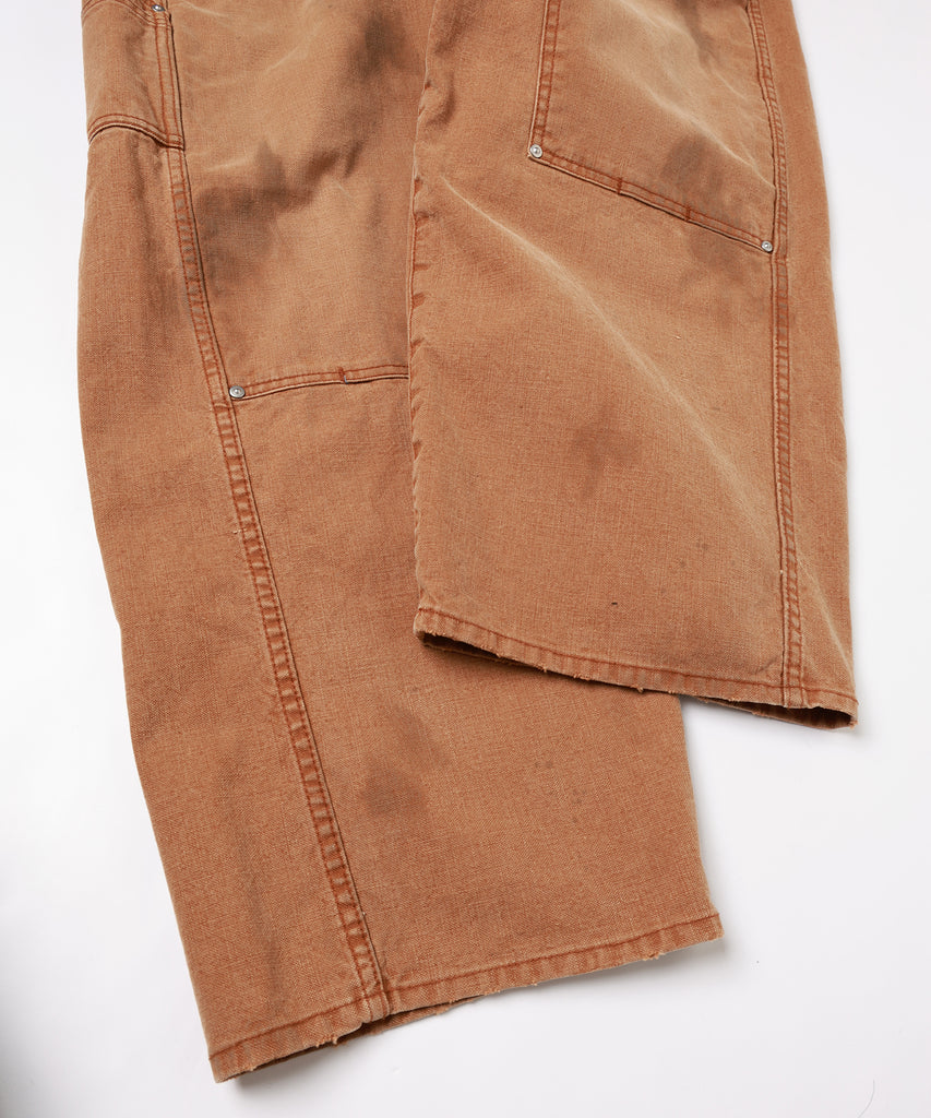 ダブルニー、ツールポケット、ハンマーループ、ダブルステッチといったワークウェアで見られるディテールを入れ、フロントや後ポケットなどに打たれたリベットがデザインのアクセントになっております。