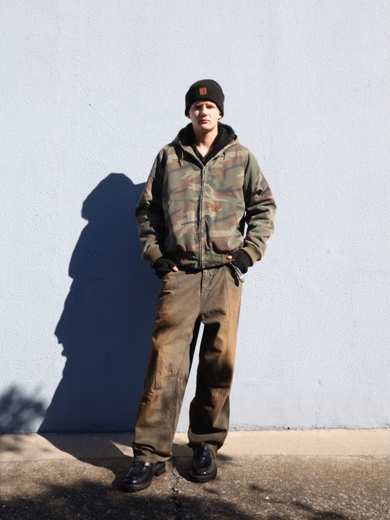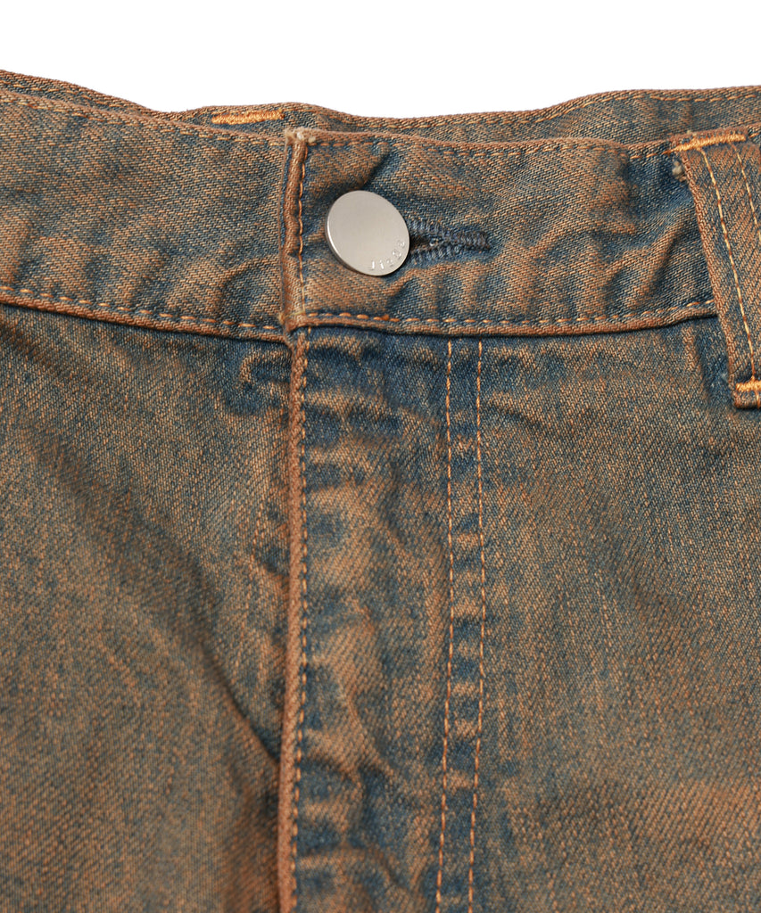 加工には、生地の表面に砂や圧縮空気を吹き付けて、あえて傷つけアタリ・色落ちを作った後、バイオウォッシュ,ヒゲ加工により表情のあるユーズド感に仕上げております。