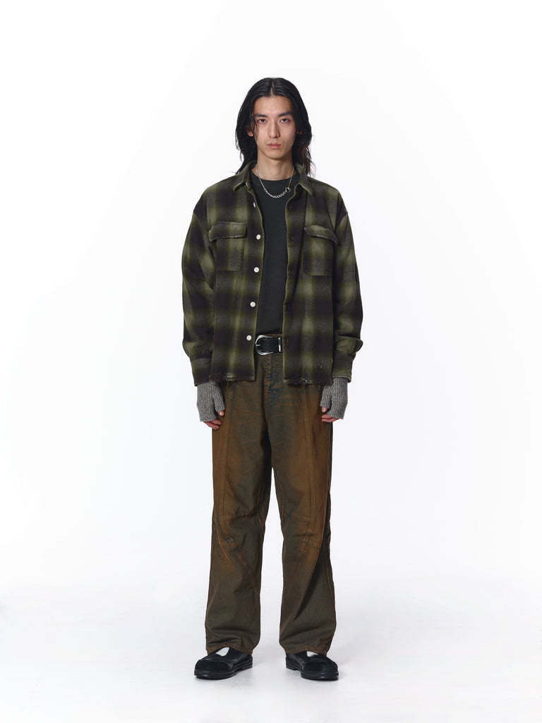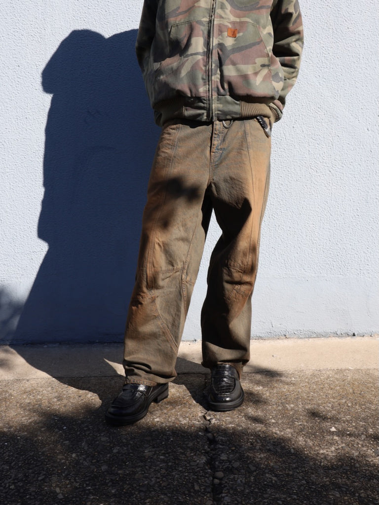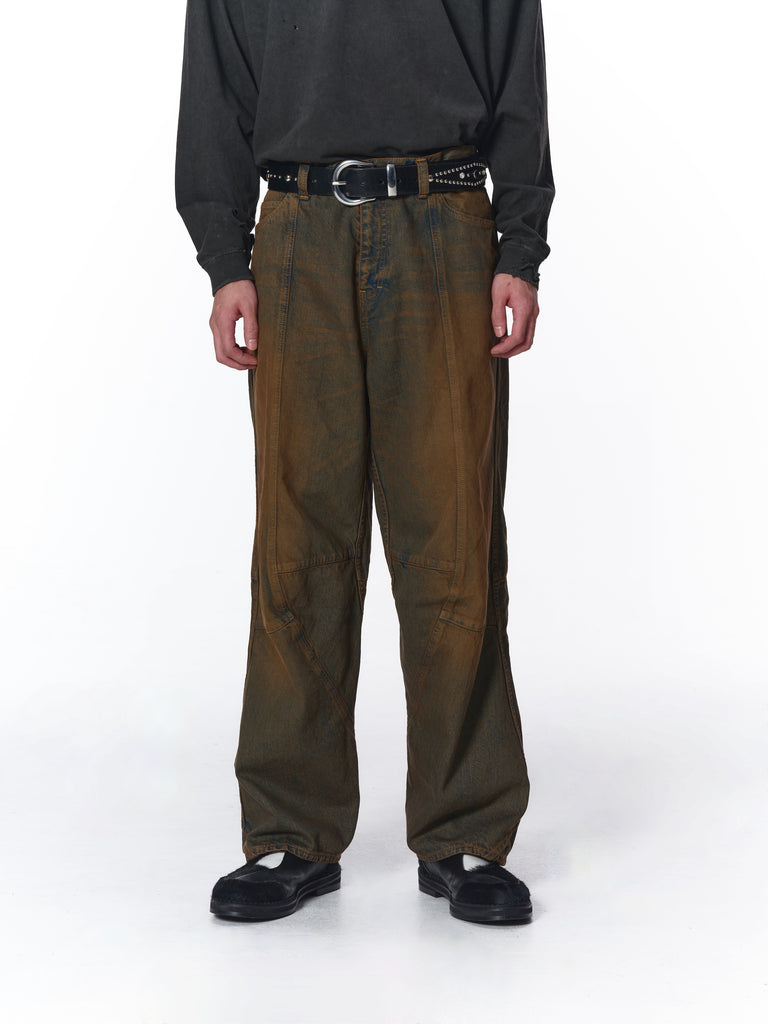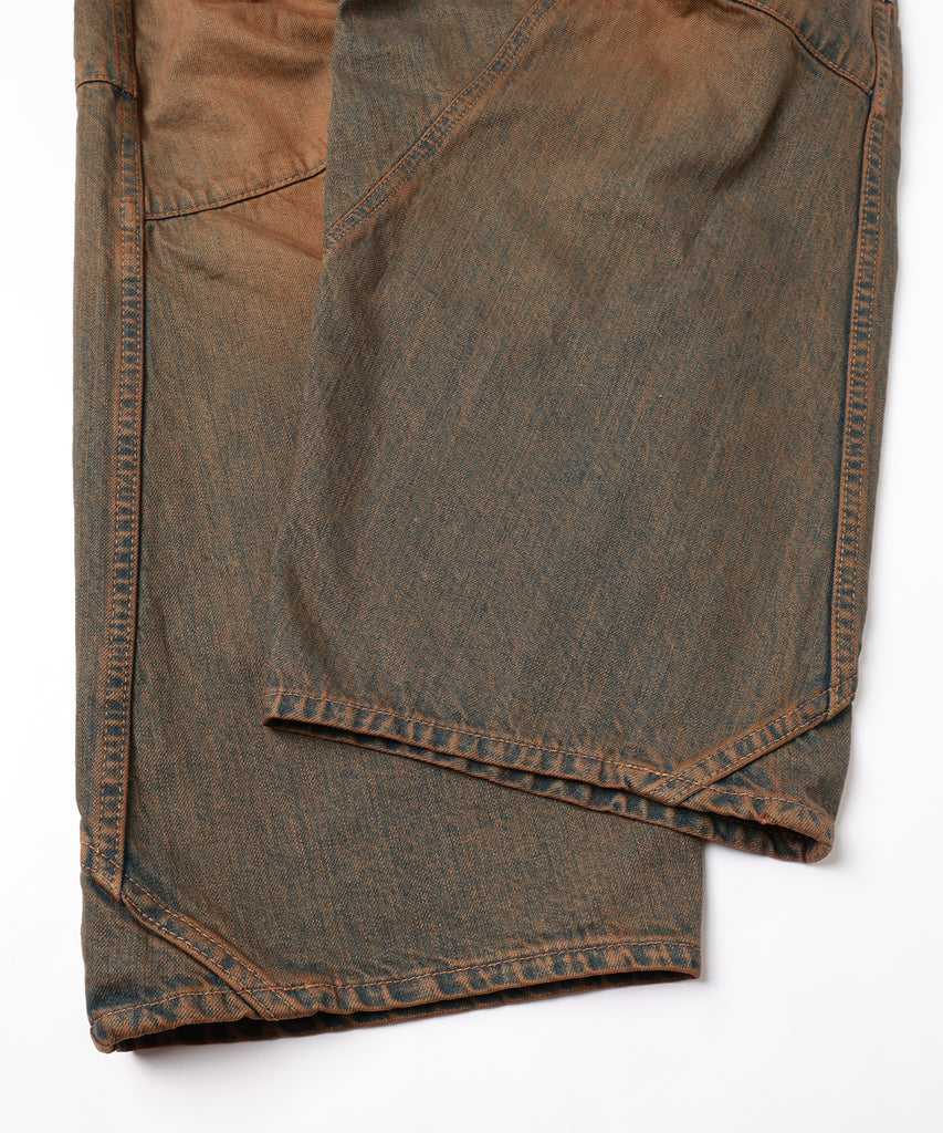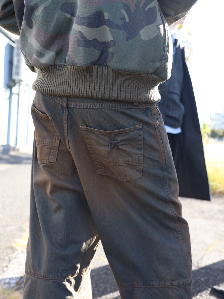 ユーズド加工が施されたスイッチングバギーデニムパンツ。