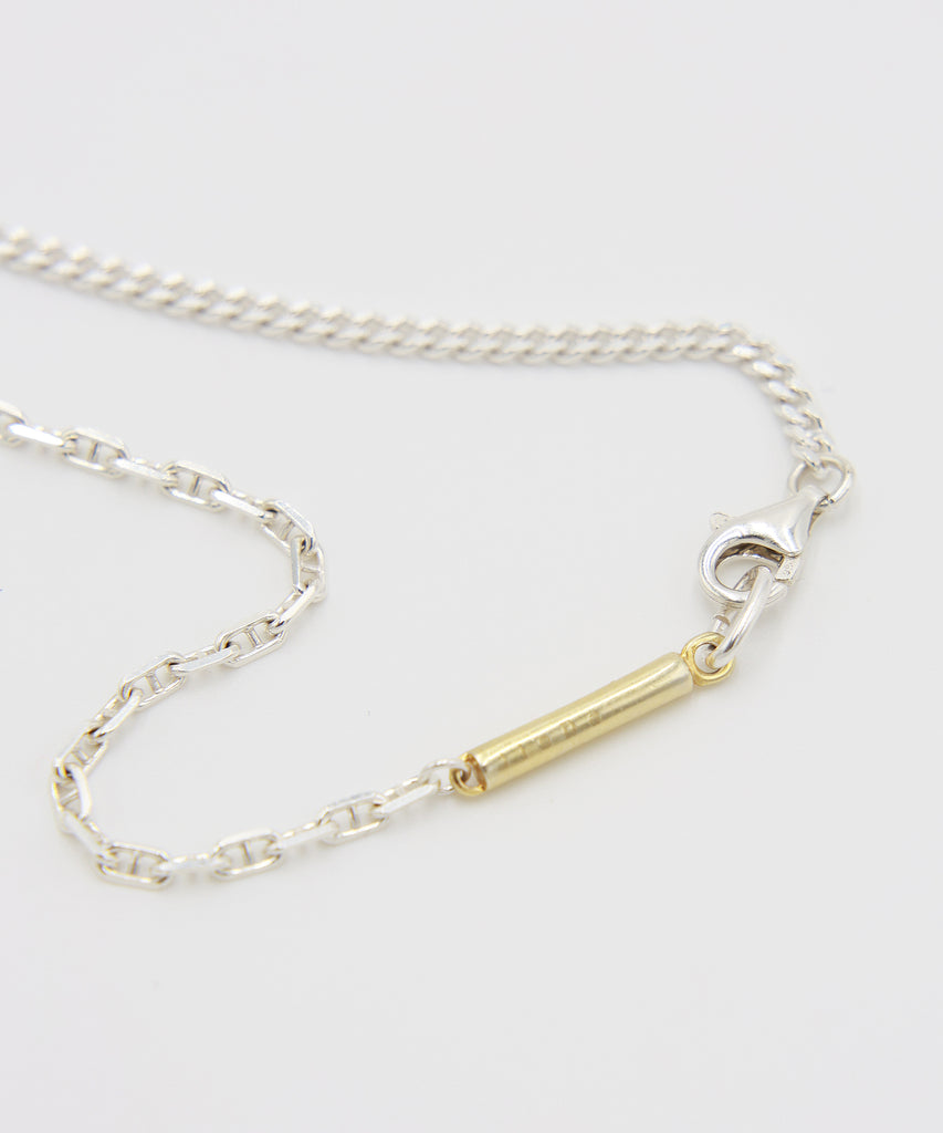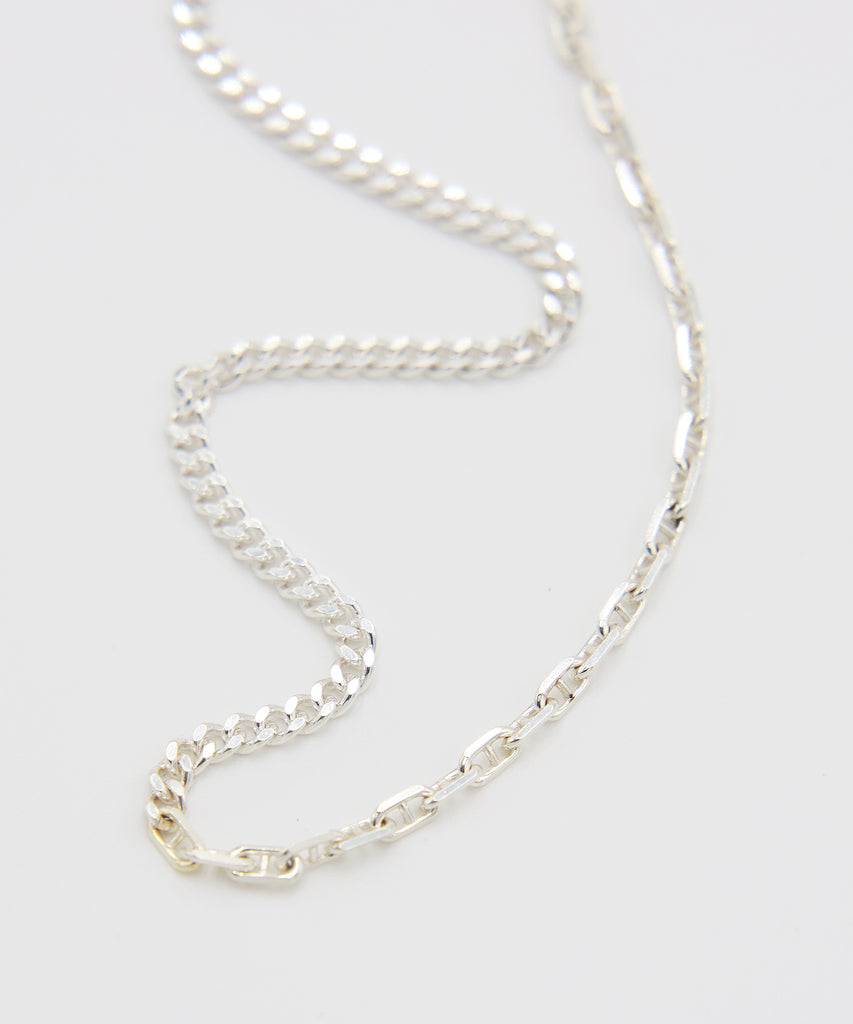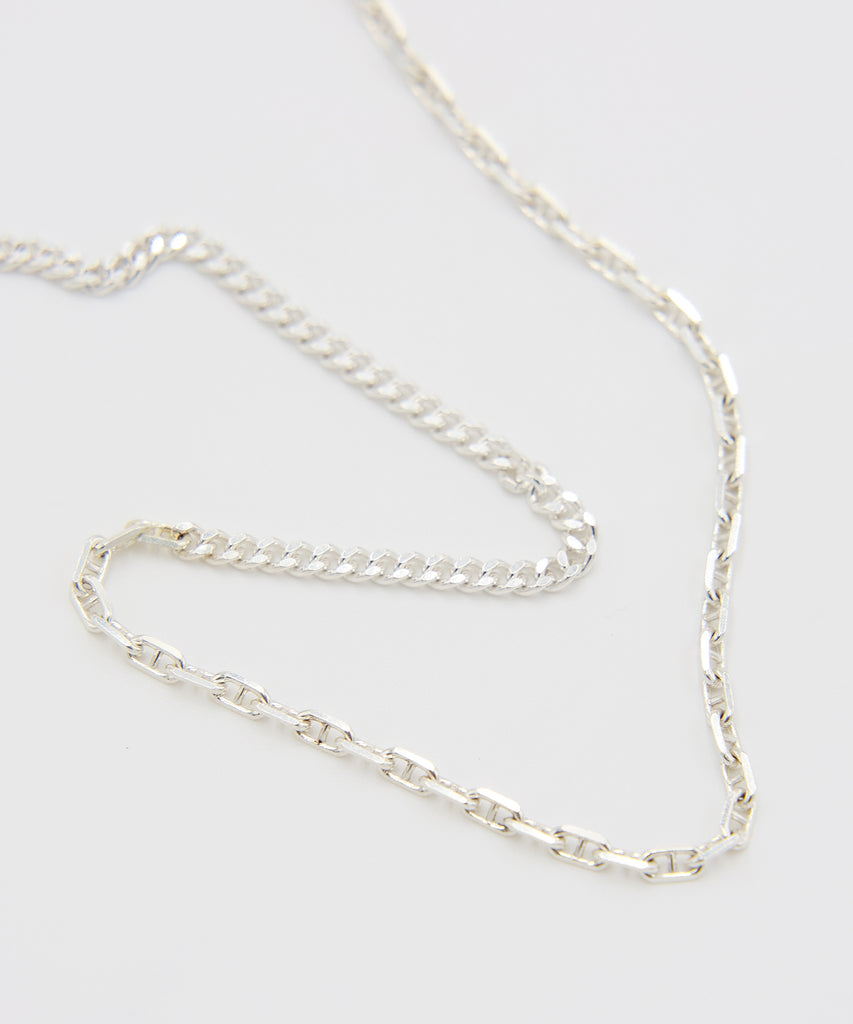 異なる細いチェーンをミックスさせたスイッチングネックレスとなっております。