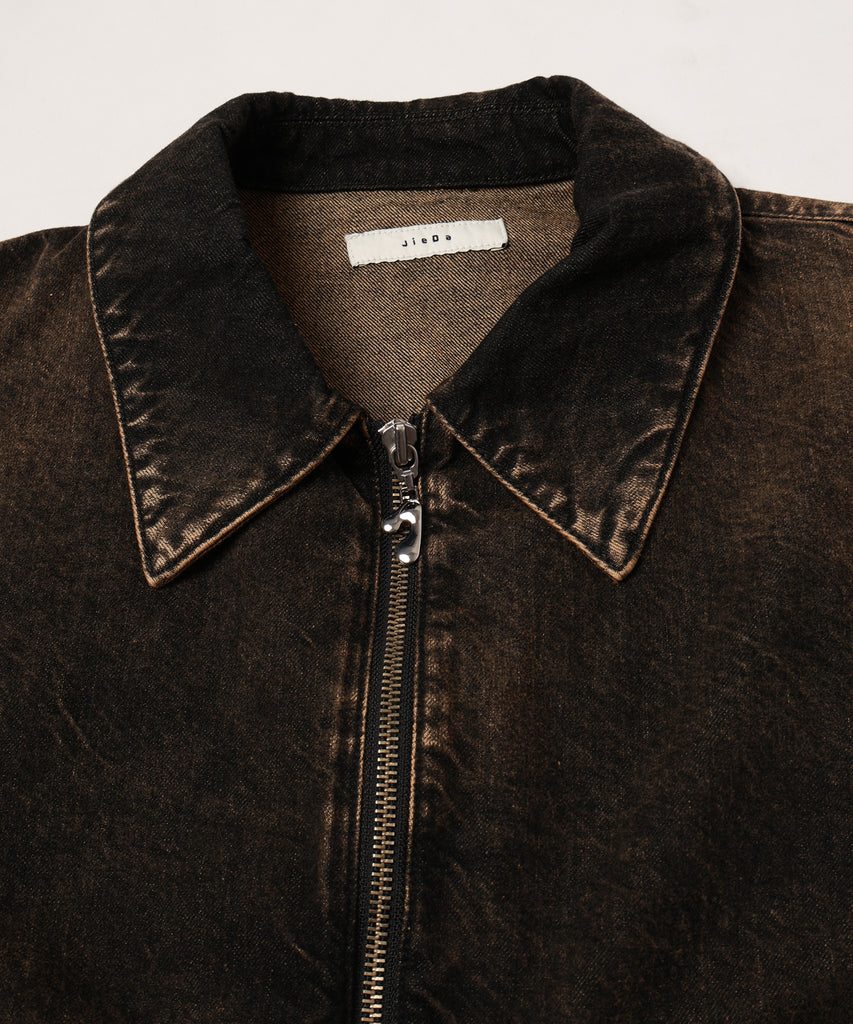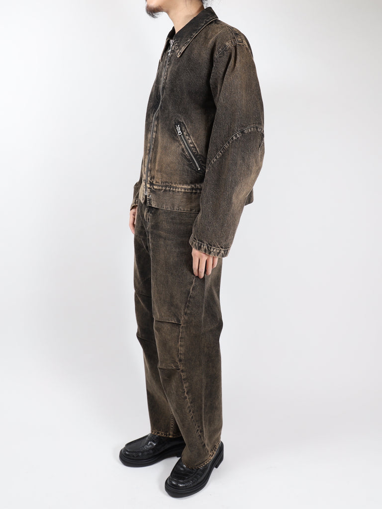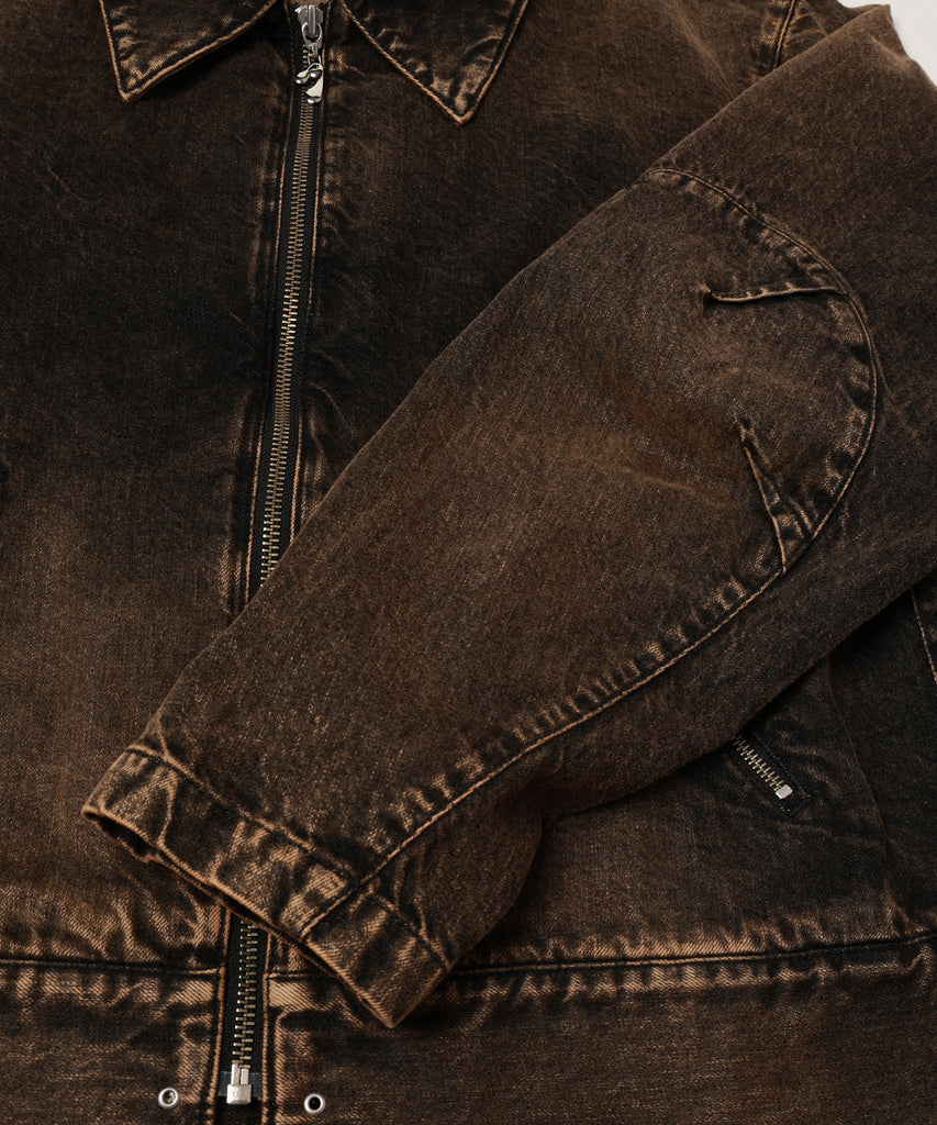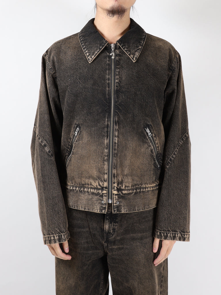 袖にはカーブした切り替えに、ダーツを入れることでミニマムながらエッジの効いたデザインとなっております。 ややゆとりのあるジャストフィットのサイジングとなっており、デニムの色に加工が馴染むよう、様々な加工工程を通し表現した加工感は、鮮やかなグラデーション感とより馴染みやすいUSED感を表現しております。 また、同加工のパンツとセットアップでの着用もおすすめのアイテムとなっております。