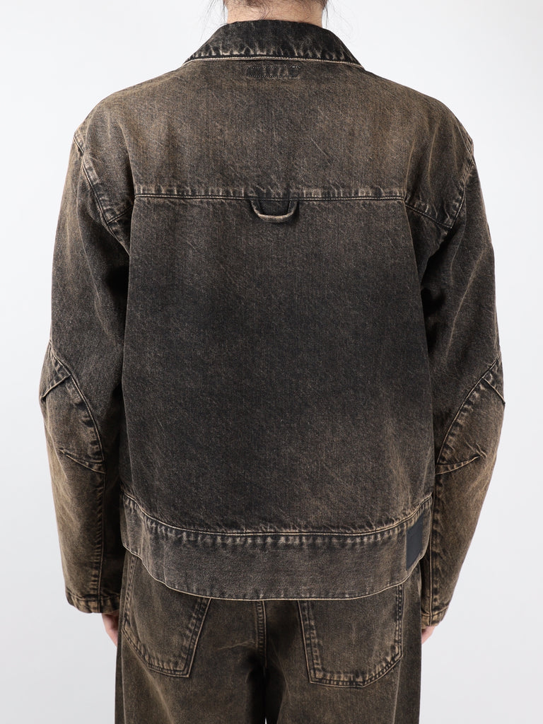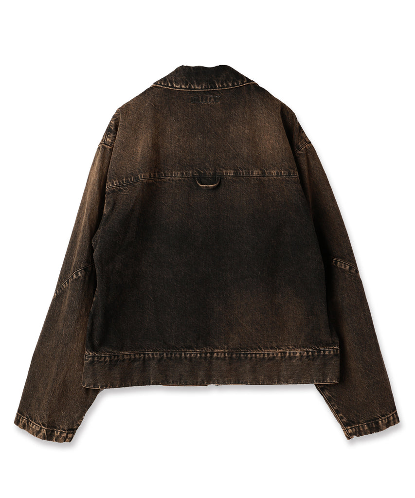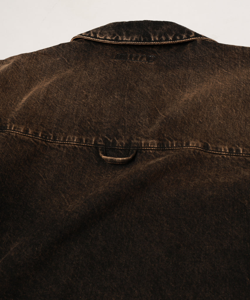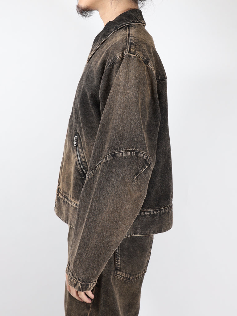 袖にはカーブした切り替えに、ダーツを入れることでミニマムながらエッジの効いたデザインとなっております。 ややゆとりのあるジャストフィットのサイジングとなっており、デニムの色に加工が馴染むよう、様々な加工工程を通し表現した加工感は、鮮やかなグラデーション感とより馴染みやすいUSED感を表現しております。 また、同加工のパンツとセットアップでの着用もおすすめのアイテムとなっております。