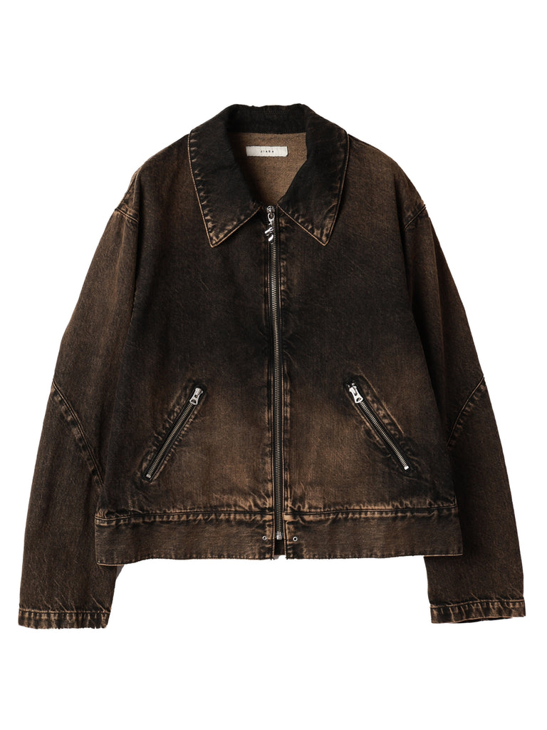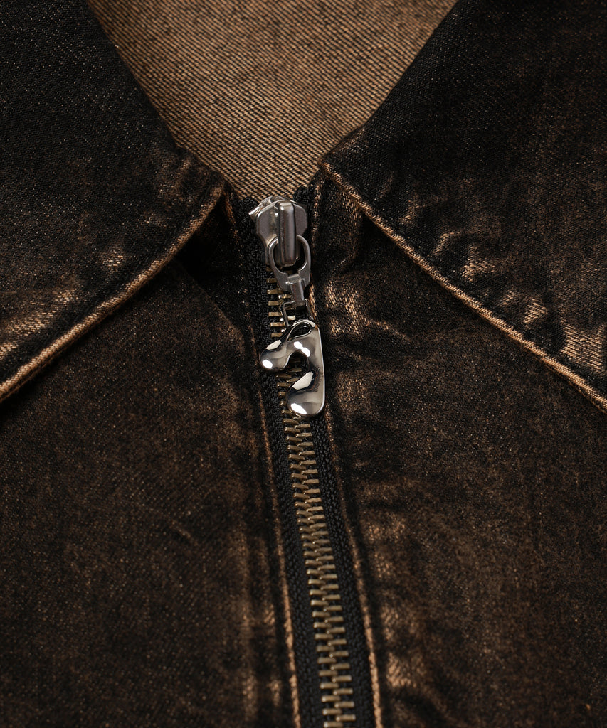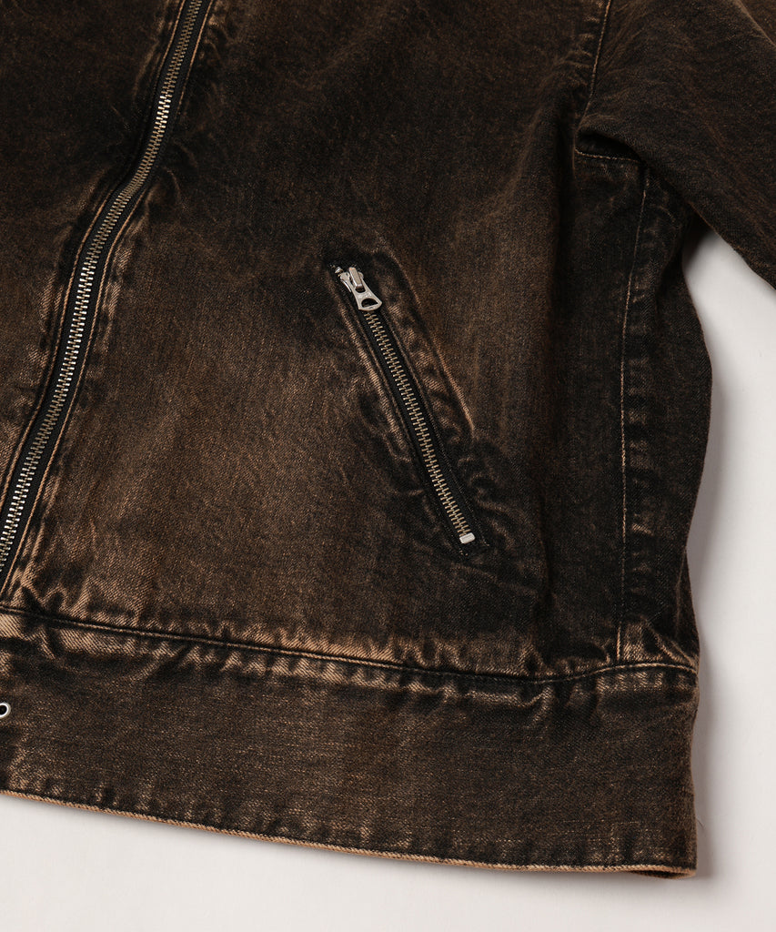 フロントにオリジナルの引手を使用したデニムジップジャケット。