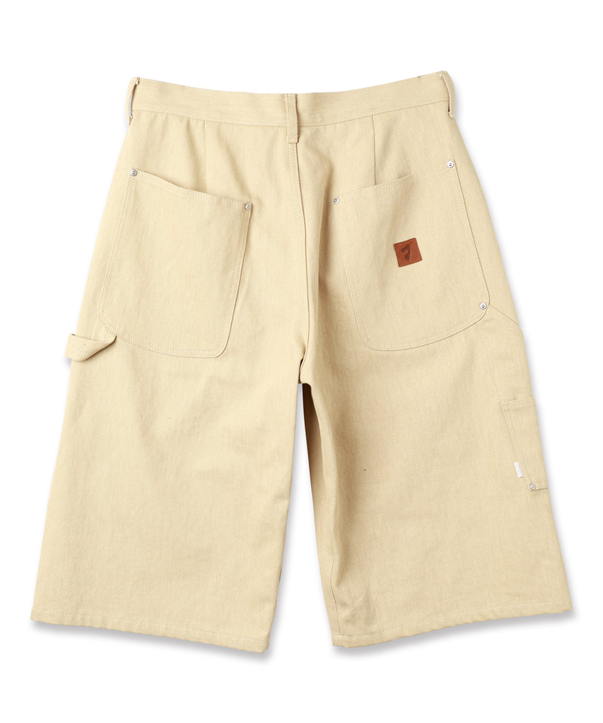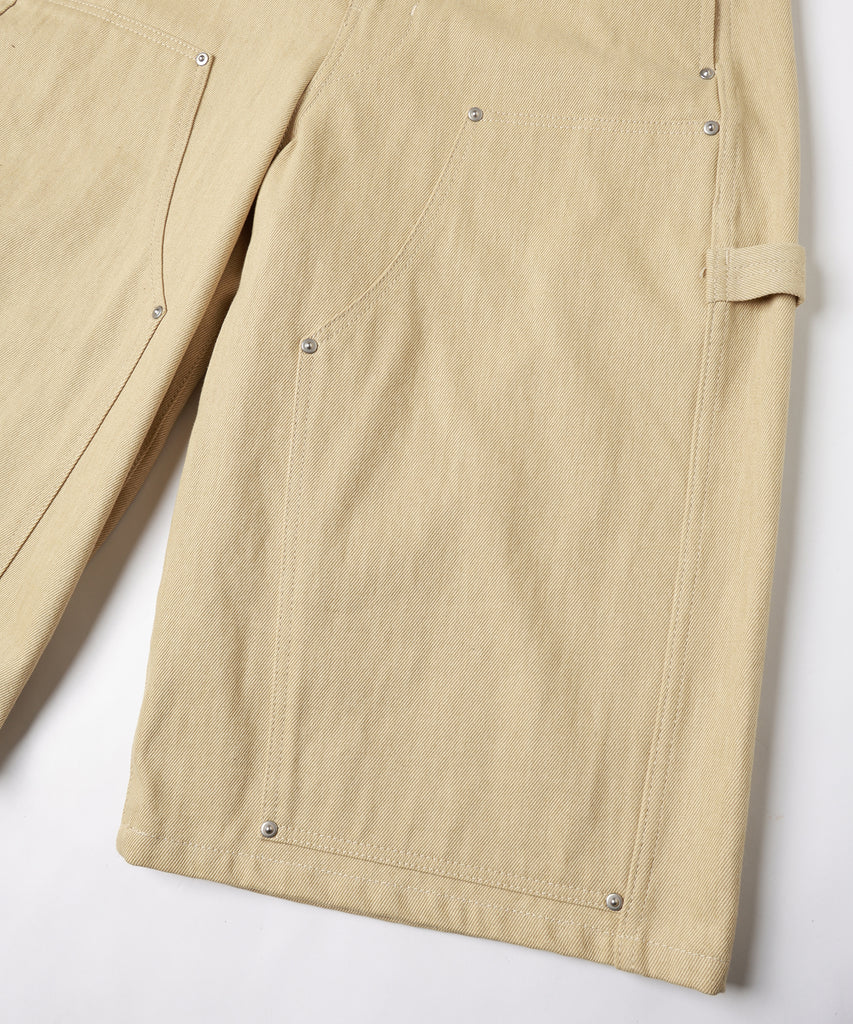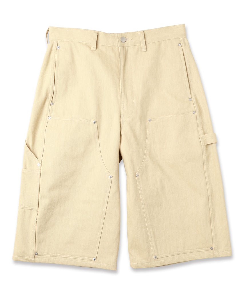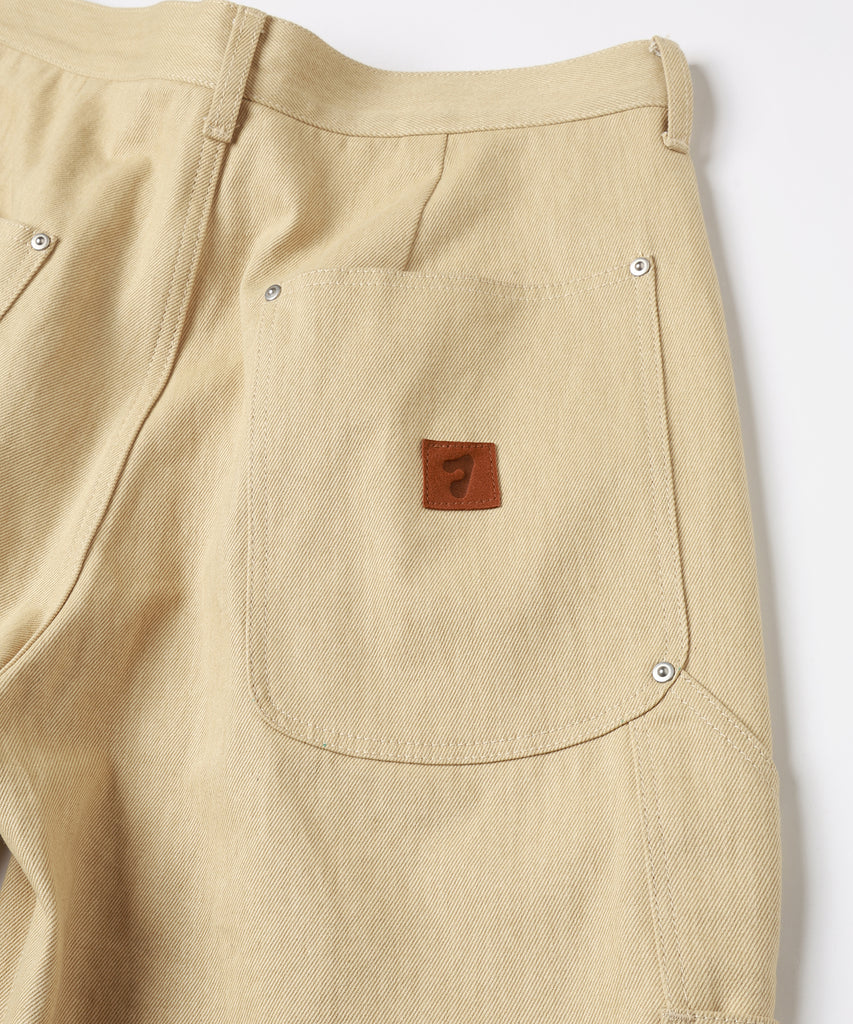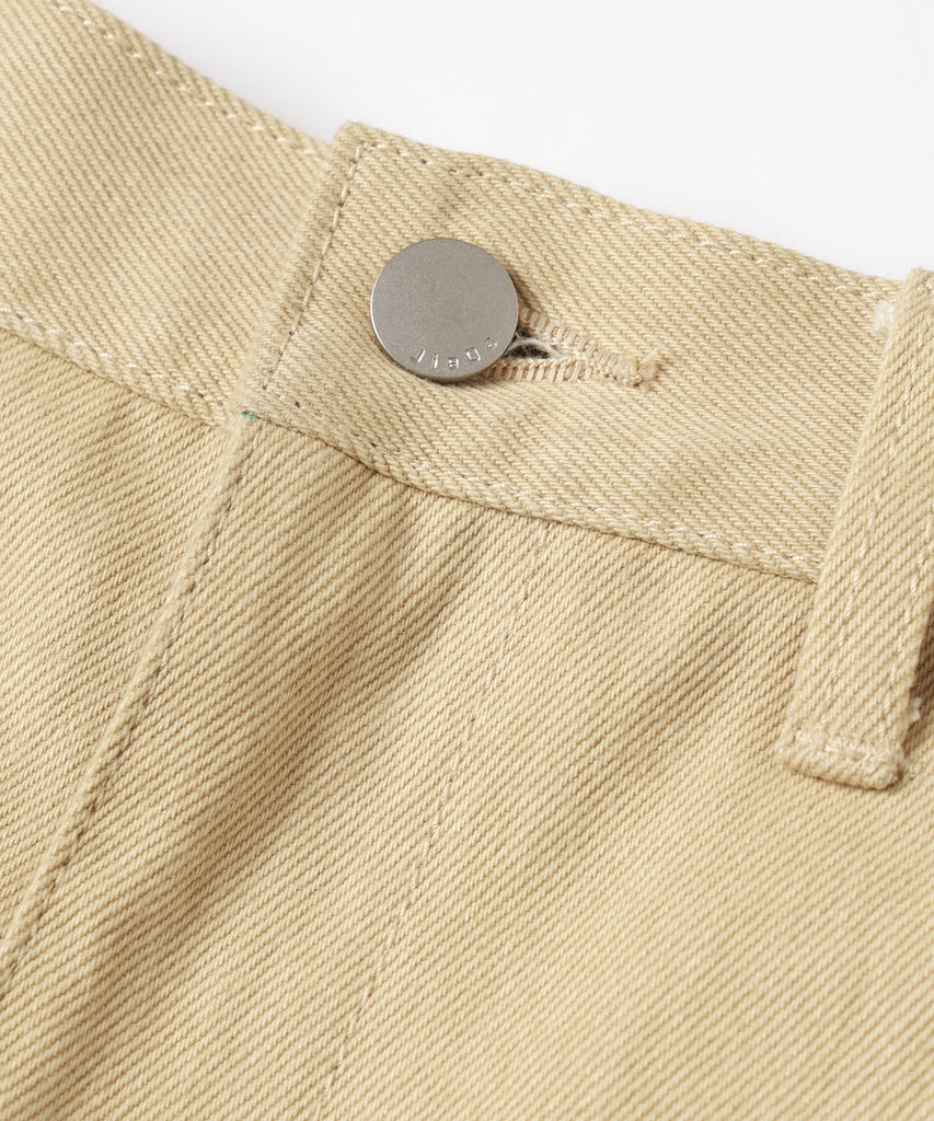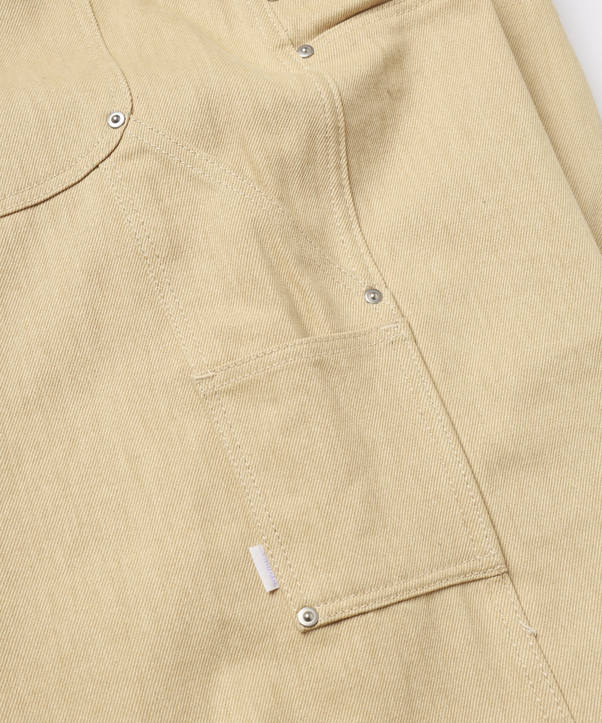 ダブルニー、ツールポケット、ハンマーループ、ダブルステッチといったワークウェアで見られるディテールを入れ、フロントや後ポケットなどに打たれたリベットがデザインのアクセントになっております。