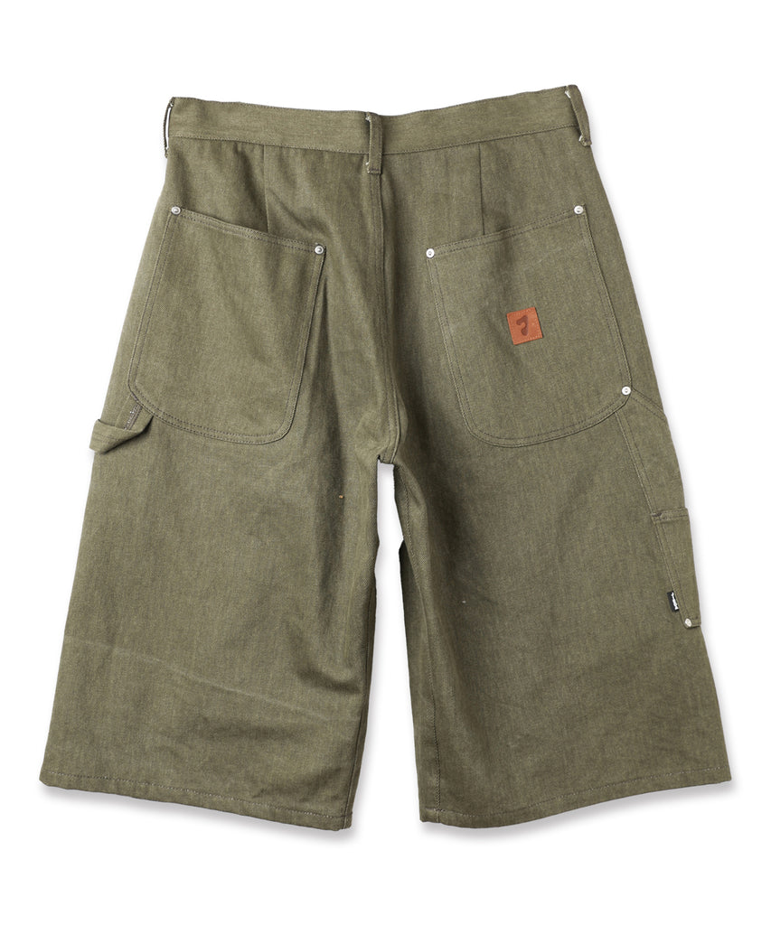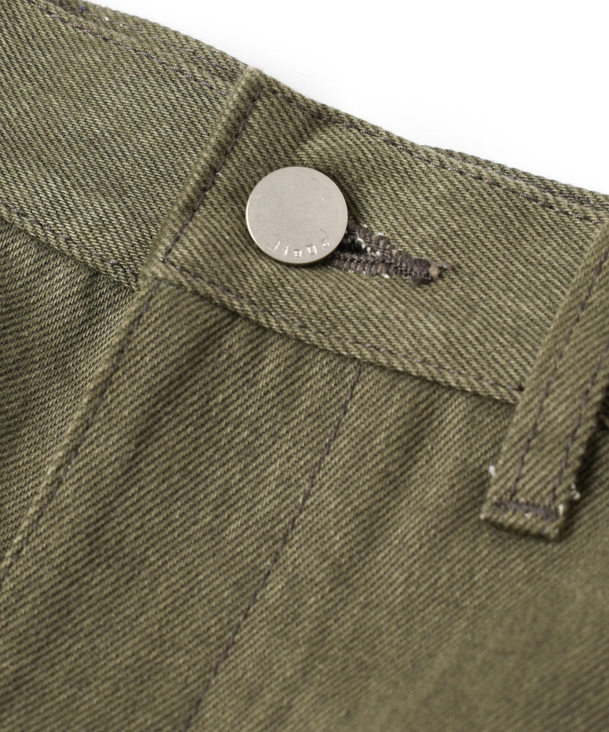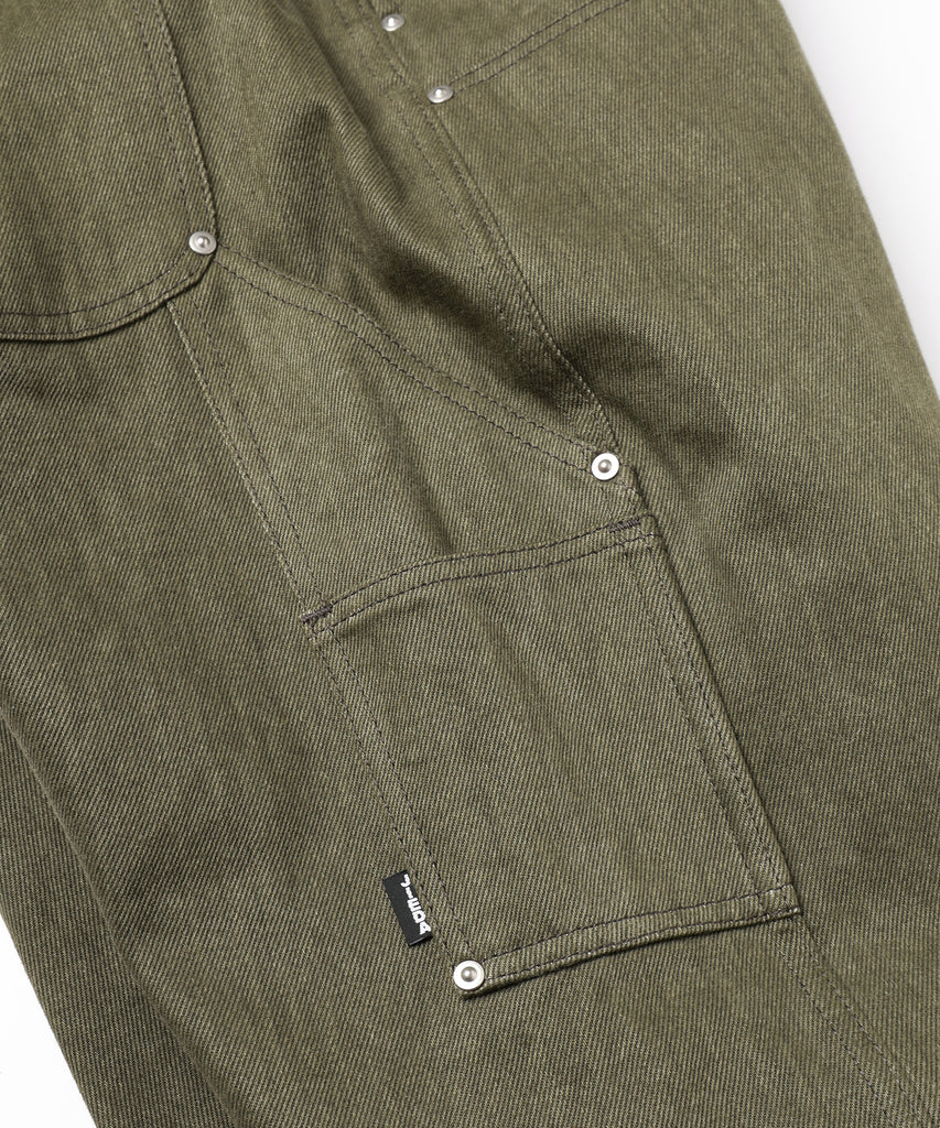ダブルニー、ツールポケット、ハンマーループ、ダブルステッチといったワークウェアで見られるディテールを入れ、フロントや後ポケットなどに打たれたリベットがデザインのアクセントになっております。