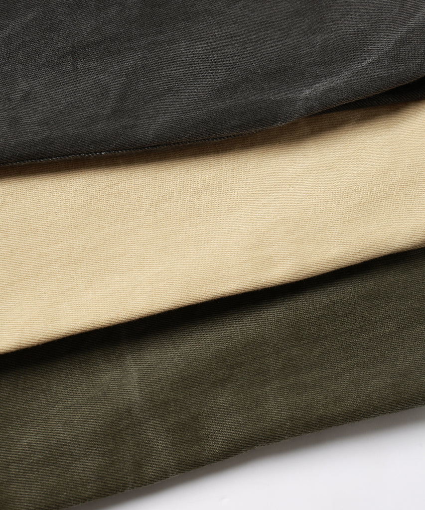 生地には、顔料コーティングに洗いを施したカツラギ生地を使用。 生地の段階で洗いを入れることで独特なユーズド感のある風合いとなっております。