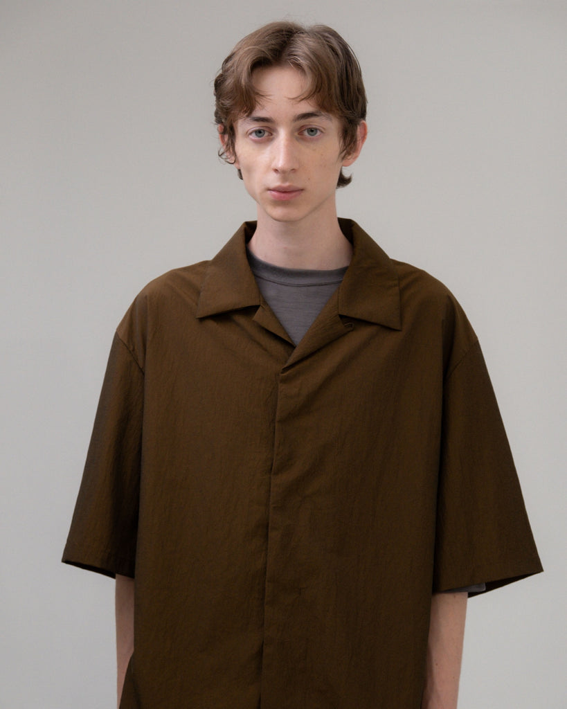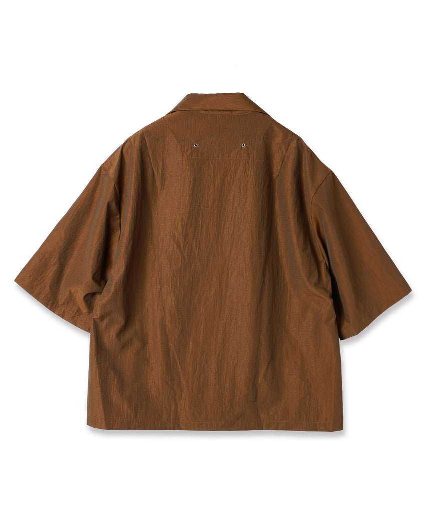 KAJIFUのナイロン素材を使用したオープンカラーショートスリーブシャツ。