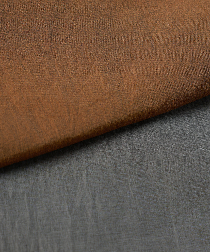 KAJIFU独自の糸加工技術で、しなやかさ・ハリ・コシのバランスを繊細に調整しており、黒ツヤの経糸×マットな緯糸が織りなすシャンブレー素材に、シワ加工をプラスし、見る角度によって表情が変わる、奥行きある風合いが特徴です。