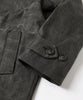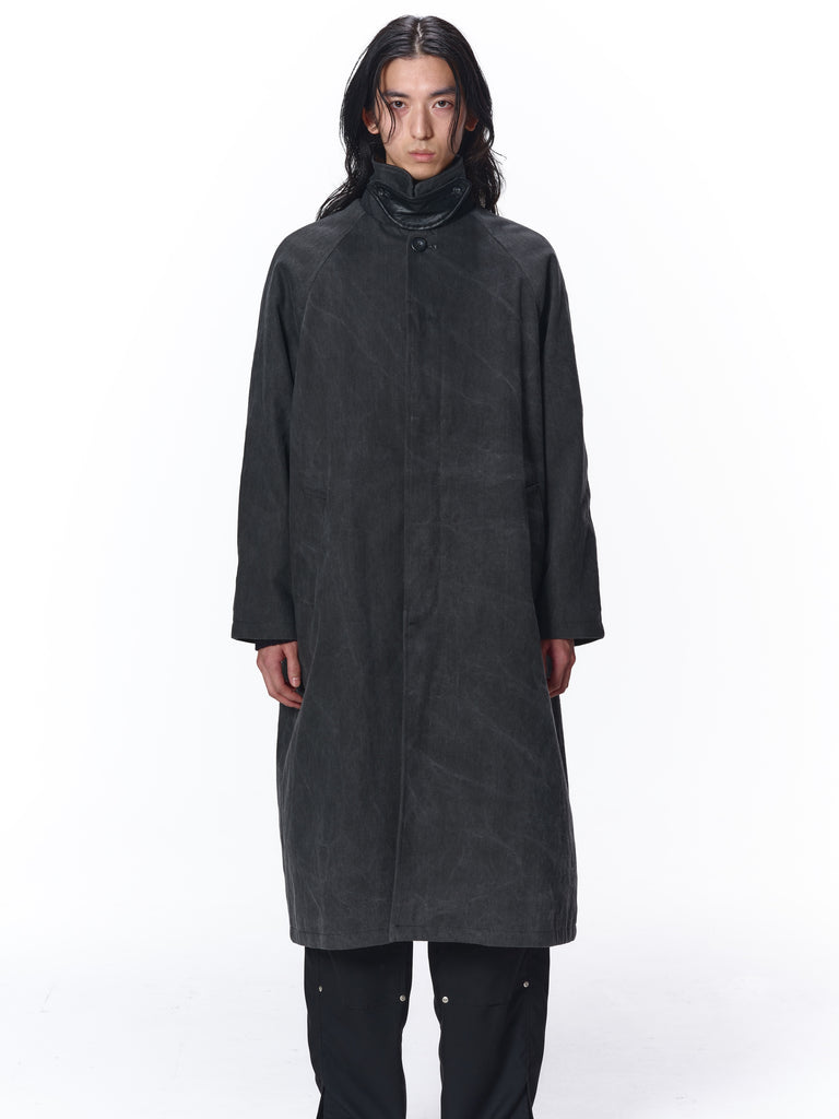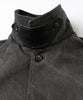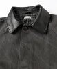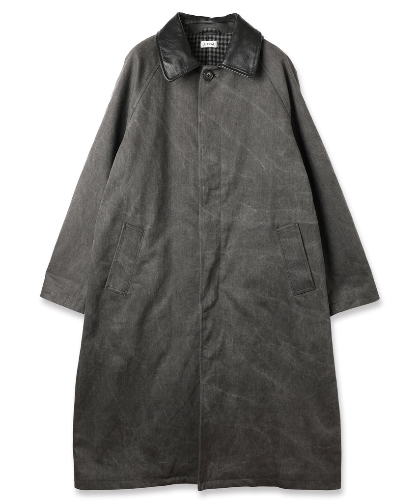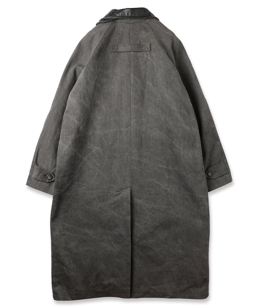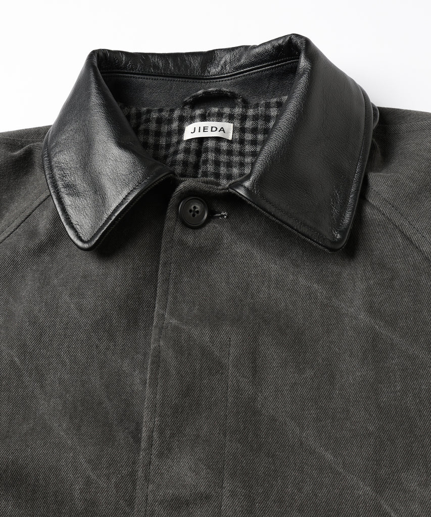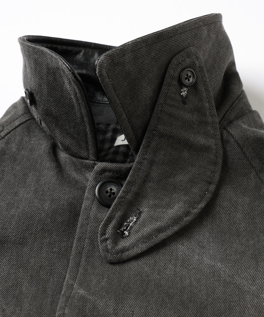 袖には袖口を調整するベルクロや衿にチンフラップを配すことで様々な着こなしができるコートとなっており、前開きは比翼の仕様にすることでよりミニマムで衿のレザーがアクセントとなった1着になっております。