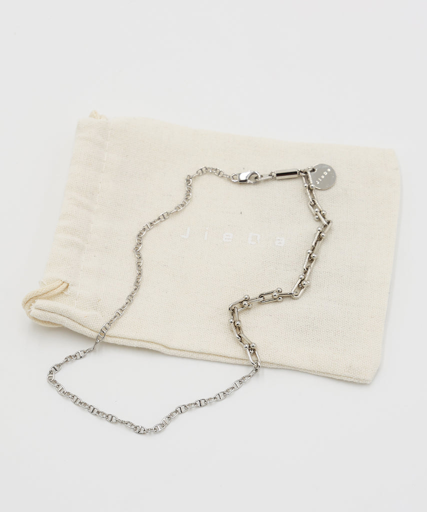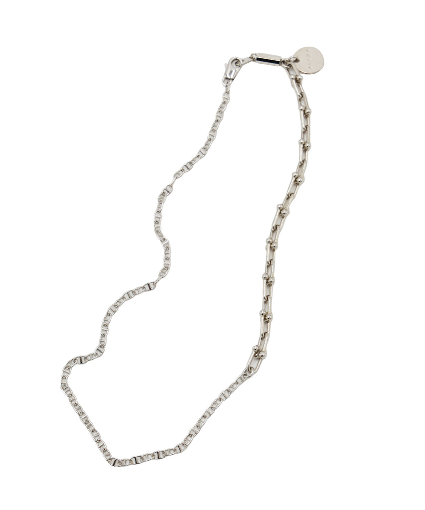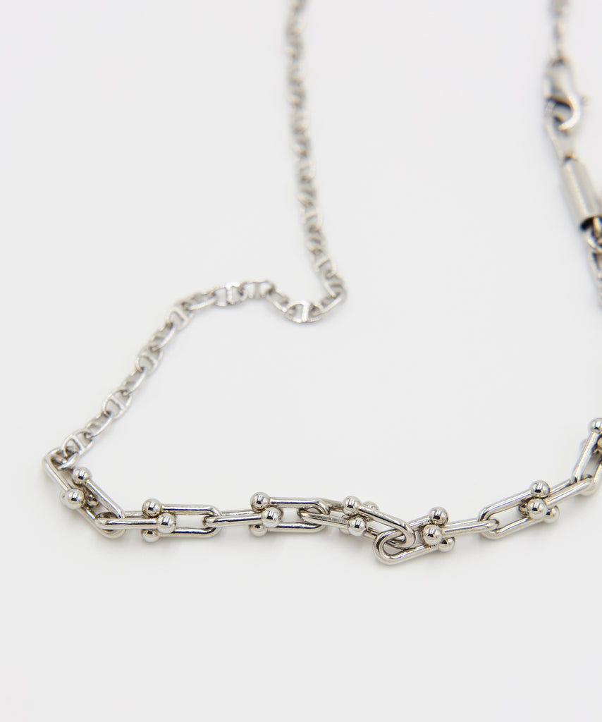 異なるチェーンをミックスさせたネックレス。