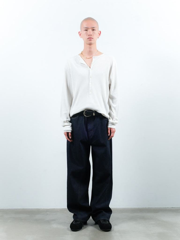 生地は12ozの国産ワンウォッシュデニム素材を使用しておりシーズンを通して快適に着用可能。着用と洗濯を重ねることで風合いの変化も楽しんで頂けます。