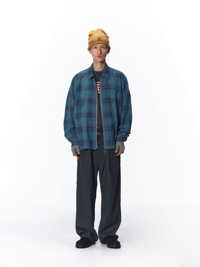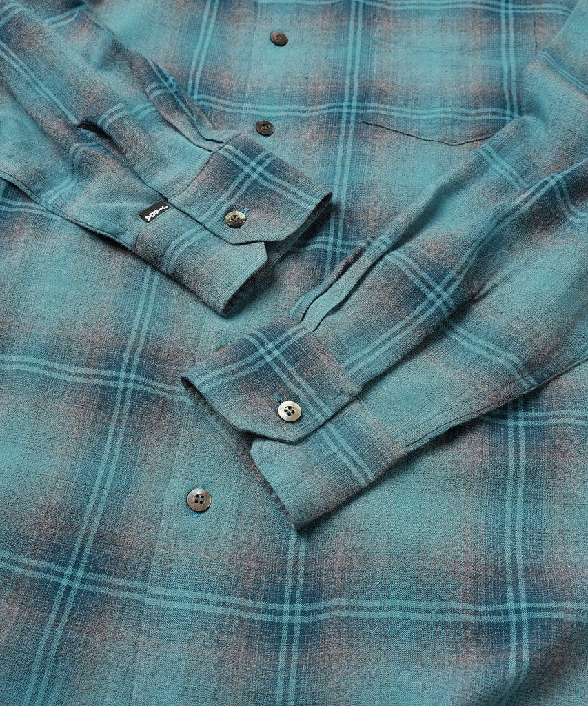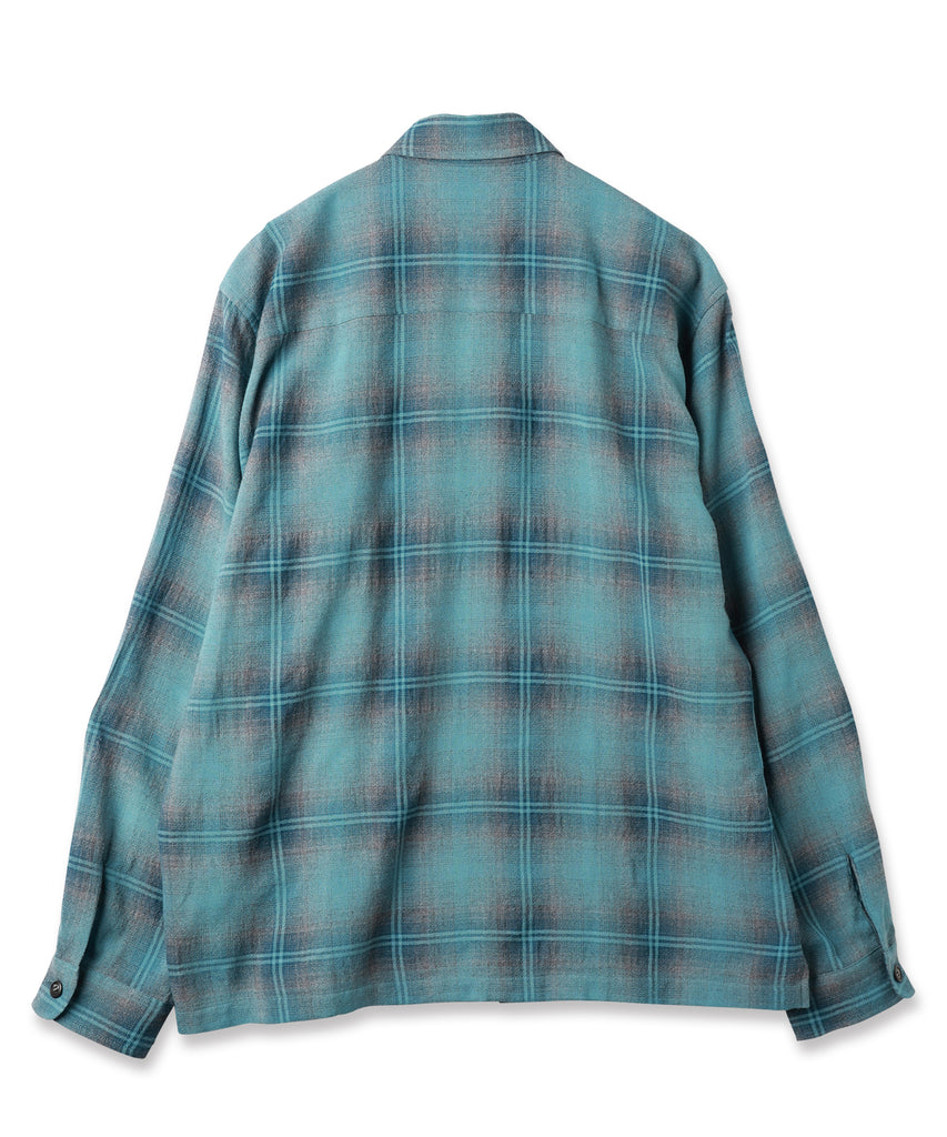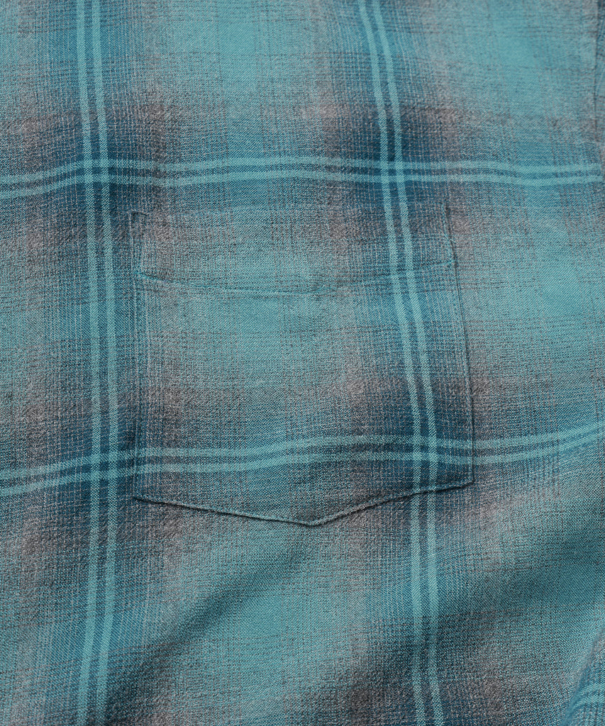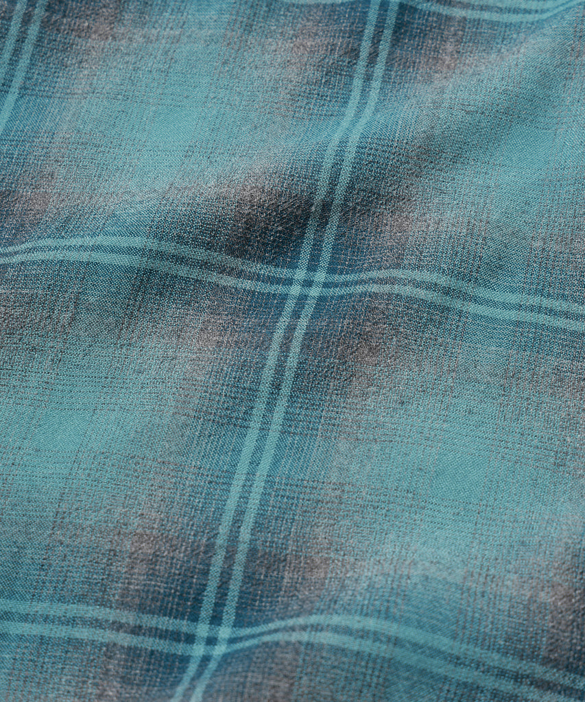 ウール,ウールTOP,レーヨンの3種の収縮差のある糸使用してオンブレチェックを作製。 ウール糸にナイロンを巻くことによってシャリ感を出し、仕上げのタンブラー加工でシボ,シワ感を表現しております。