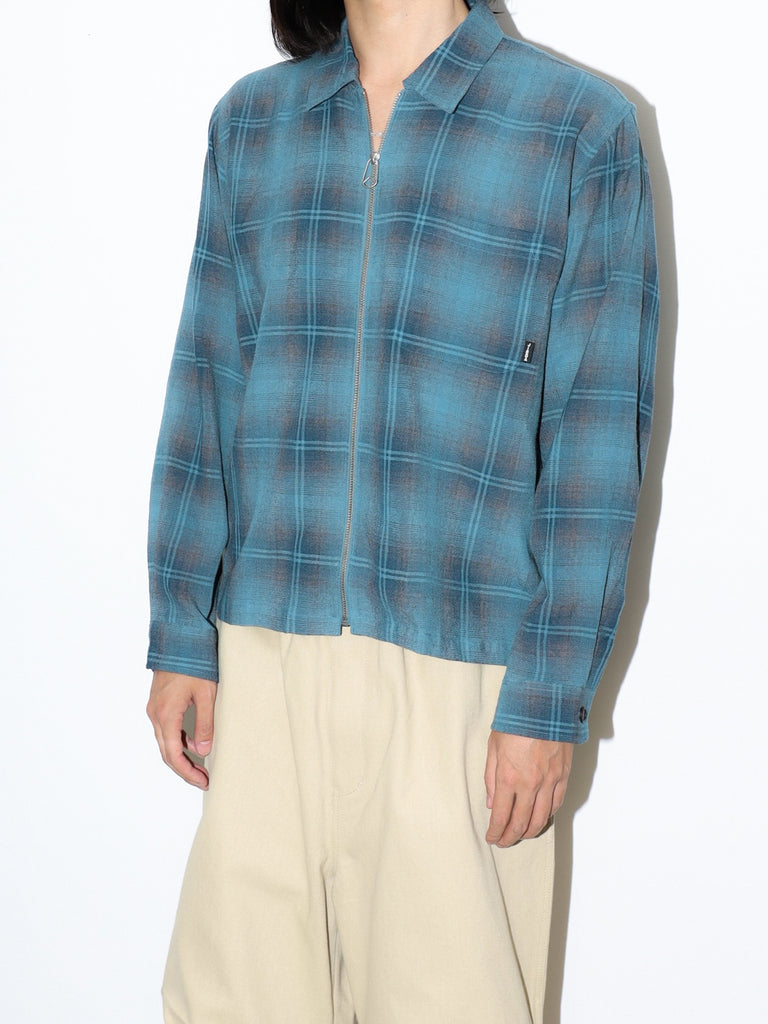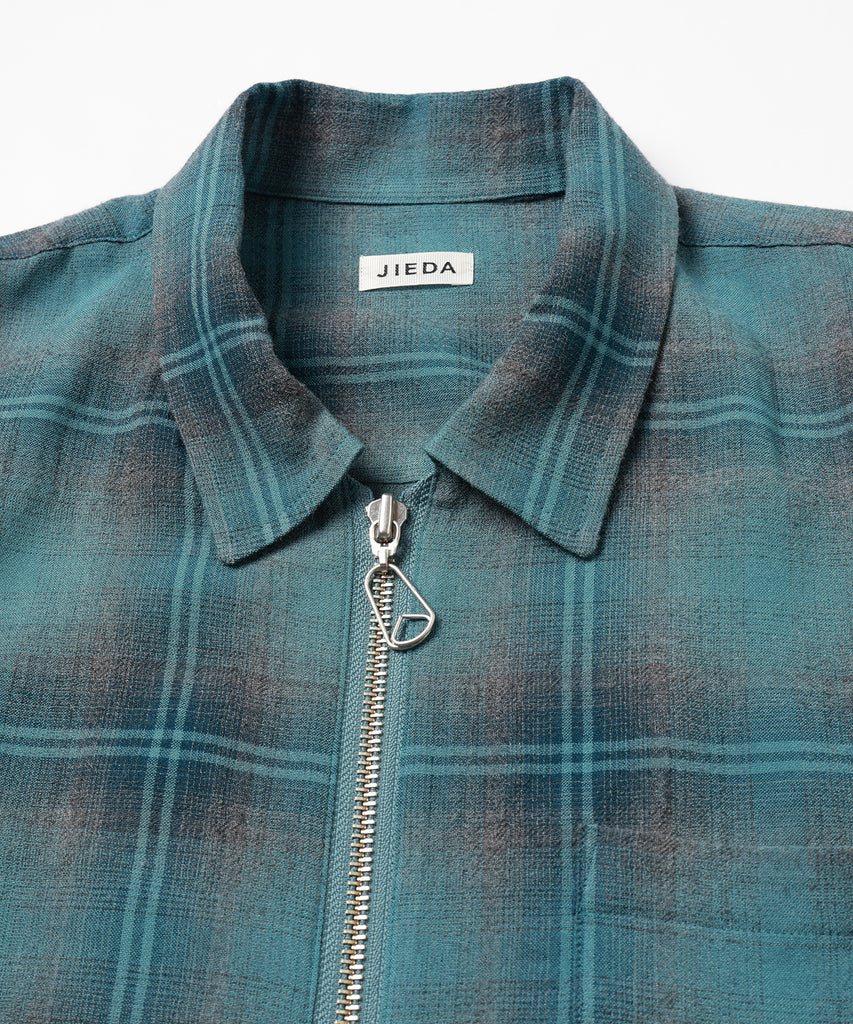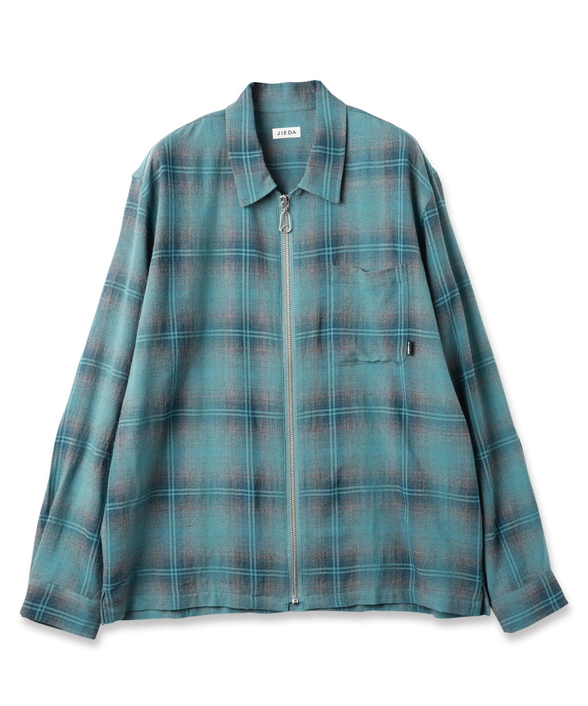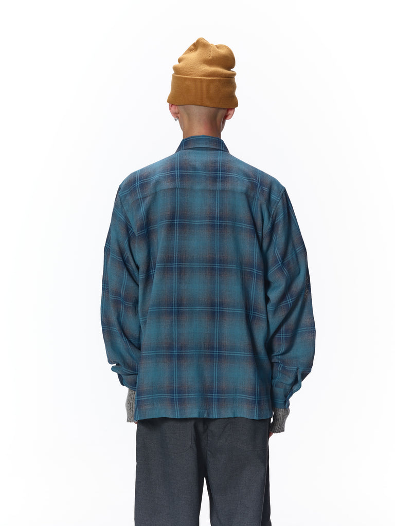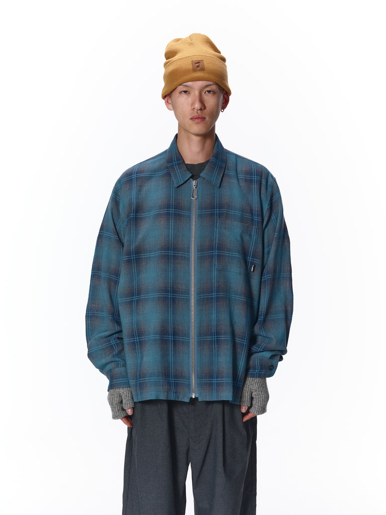 ウール,ウールTOP,レーヨンの3種の収縮差のある糸使用してオンブレチェックを作製。 ウール糸にナイロンを巻くことによってシャリ感を出し、仕上げのタンブラー加工でシボ,シワ感を表現しております。