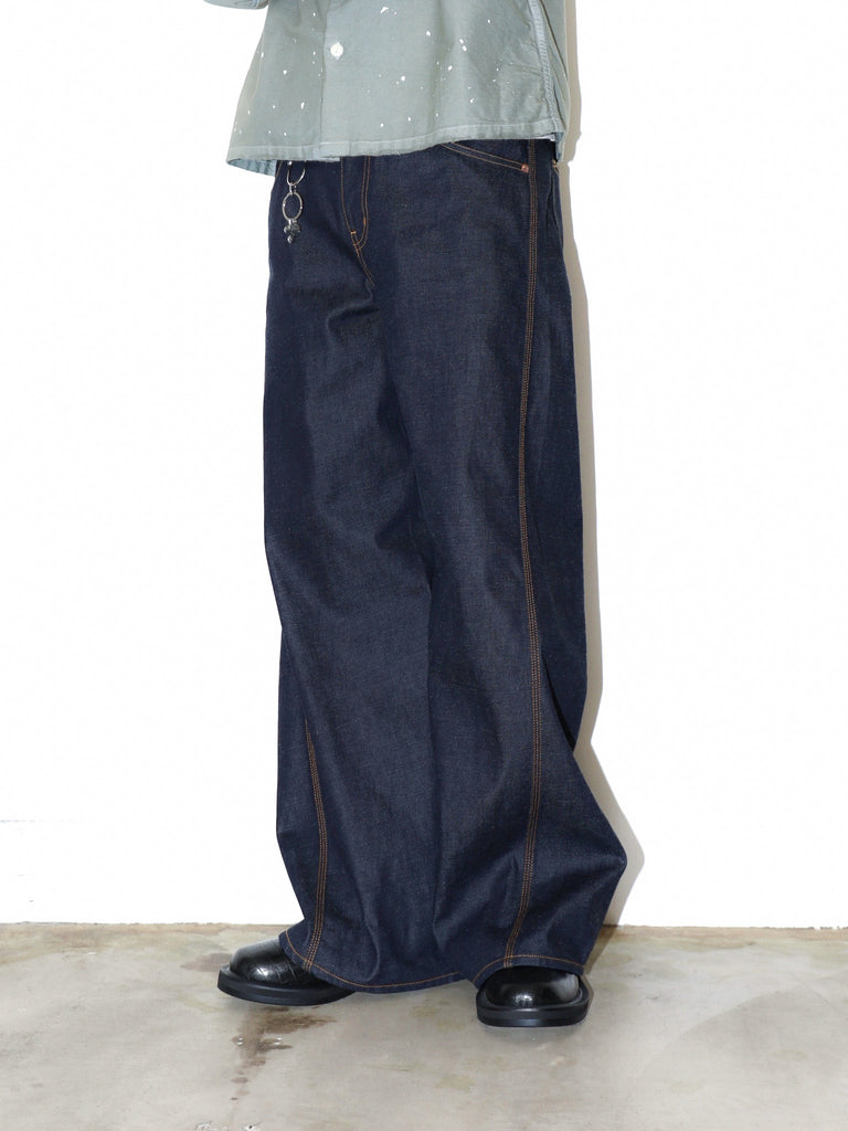立体的なパターンによるサイドシームの捻れが独特なシルエットを生み出し、股上を浅めに設定することで腰回りはスッキリとしたシルエットが特徴的なワイドデニムとなっております。