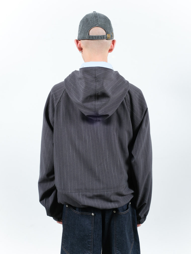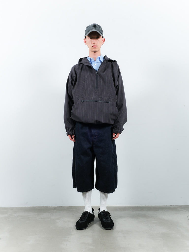 シアサッカーチェック生地とチョークストライプ生地を使用したプルオーバーパーカー。