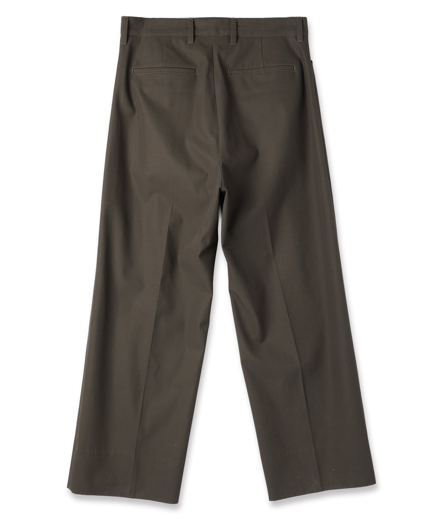 ワイドストレートリラックスフィットのシルエット。フロントポケットはL字型ポケットとなっており、バックは後ダーツ、玉縁ポケット仕様。