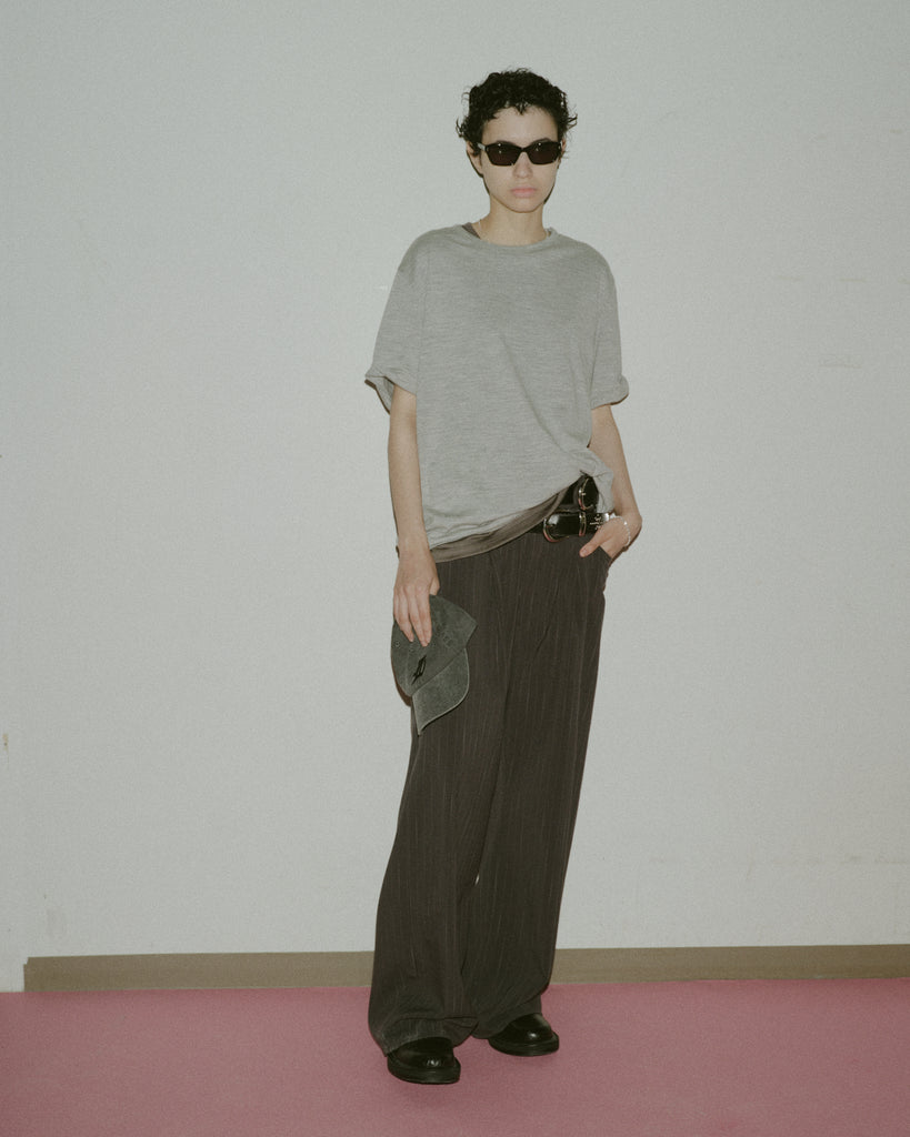 ワンタックを配したストレートシルエットのワイドパンツとなっており、股上を深めに設定し、腰回りをスッキリさせることでミニマルなデザインながらも、シルエットにこだわった1着となっております。