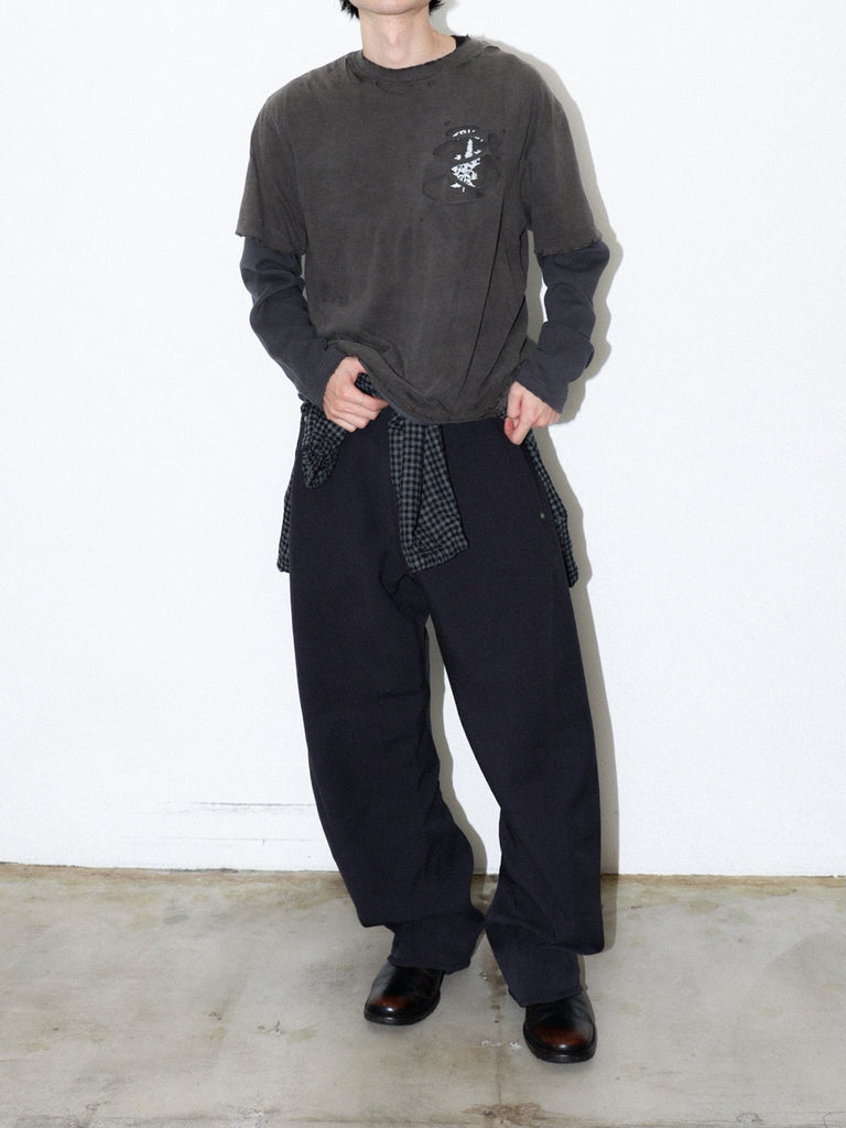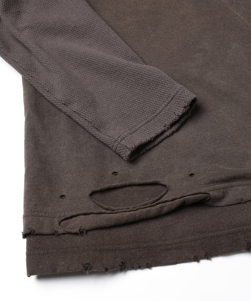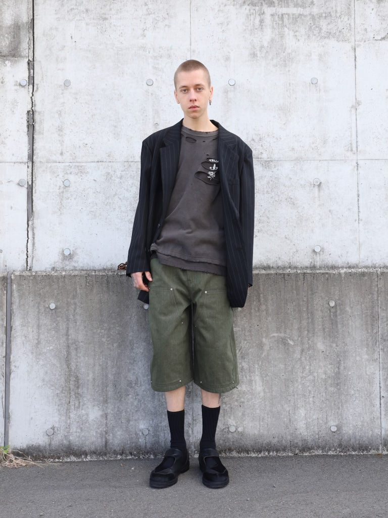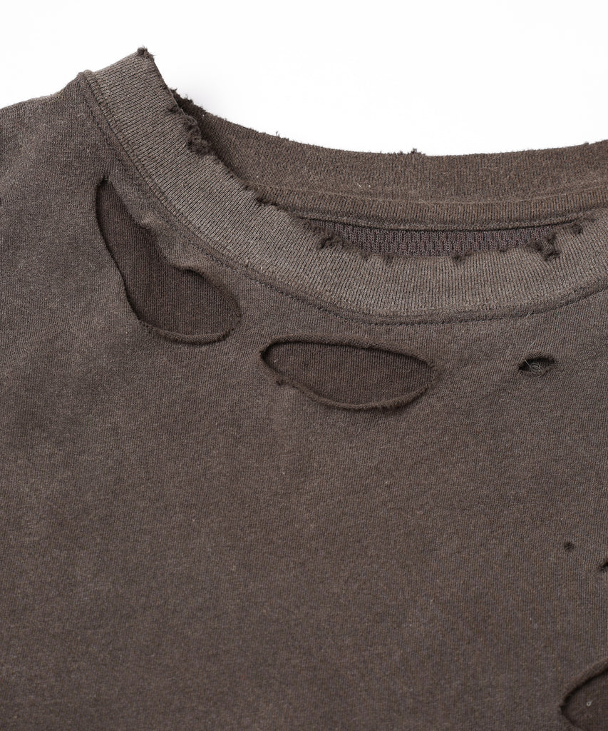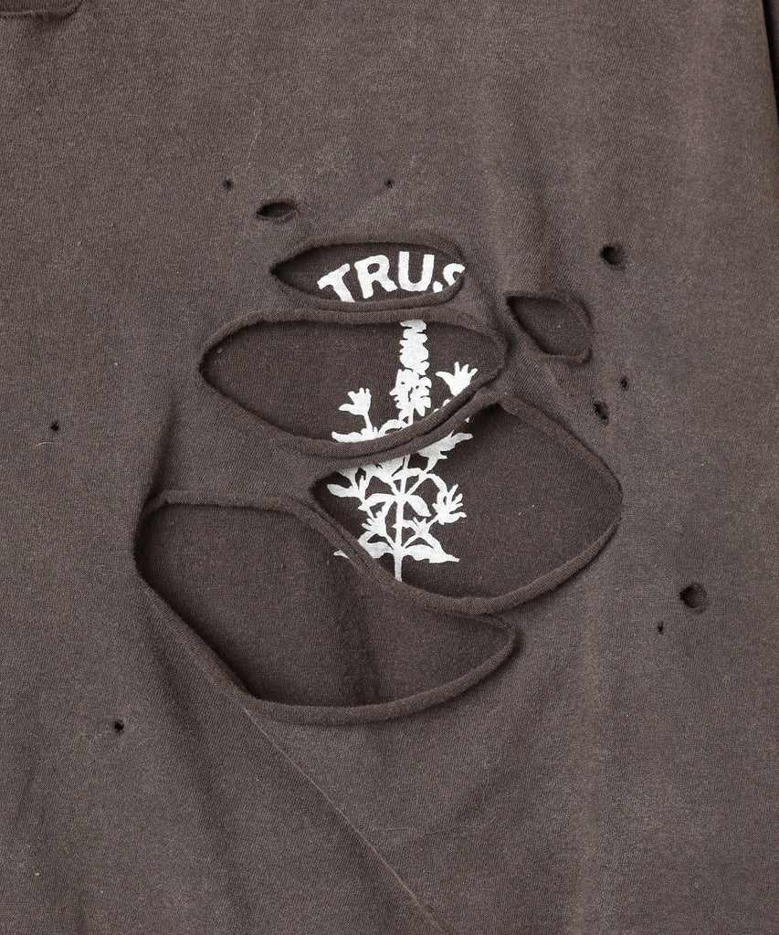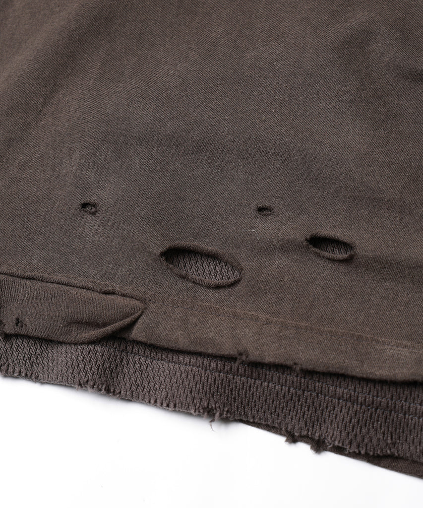 随所にあしらったダメージと左胸に配したプリントがアクセントとなっております。