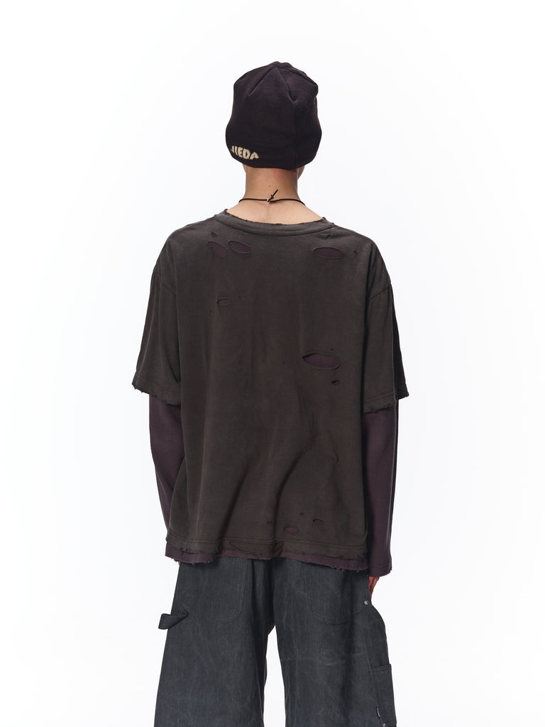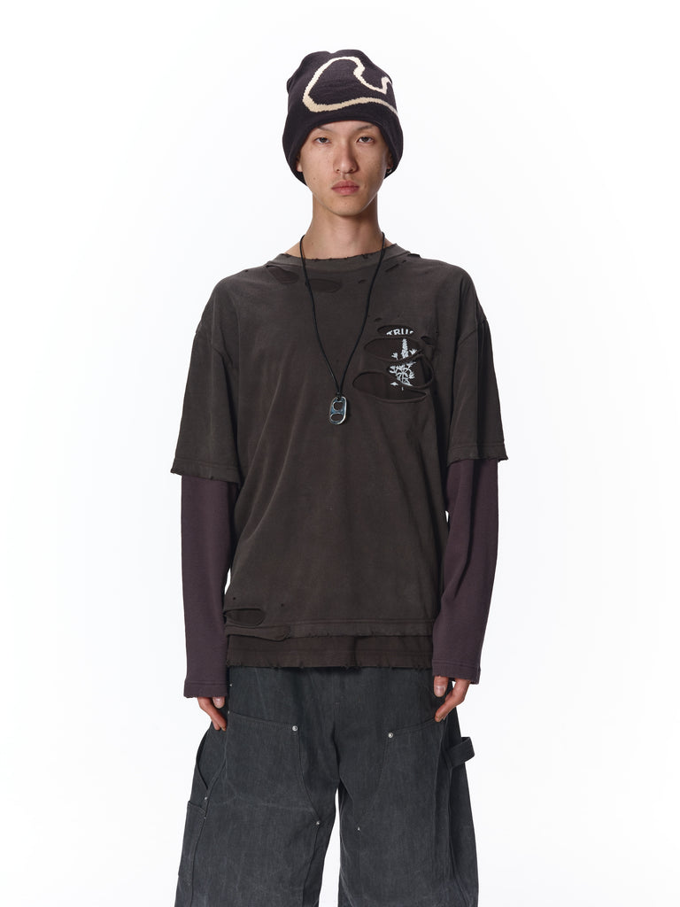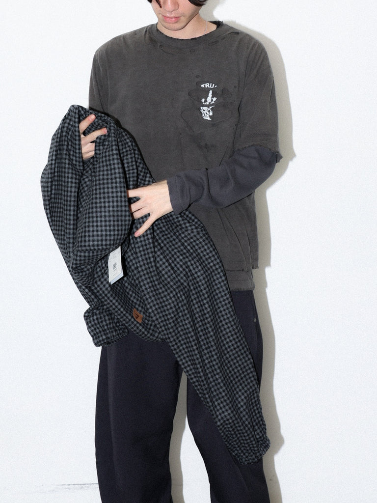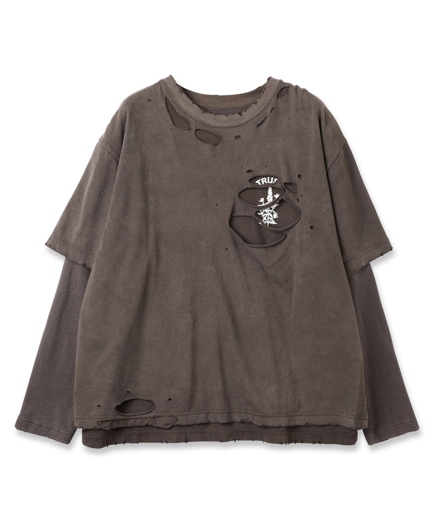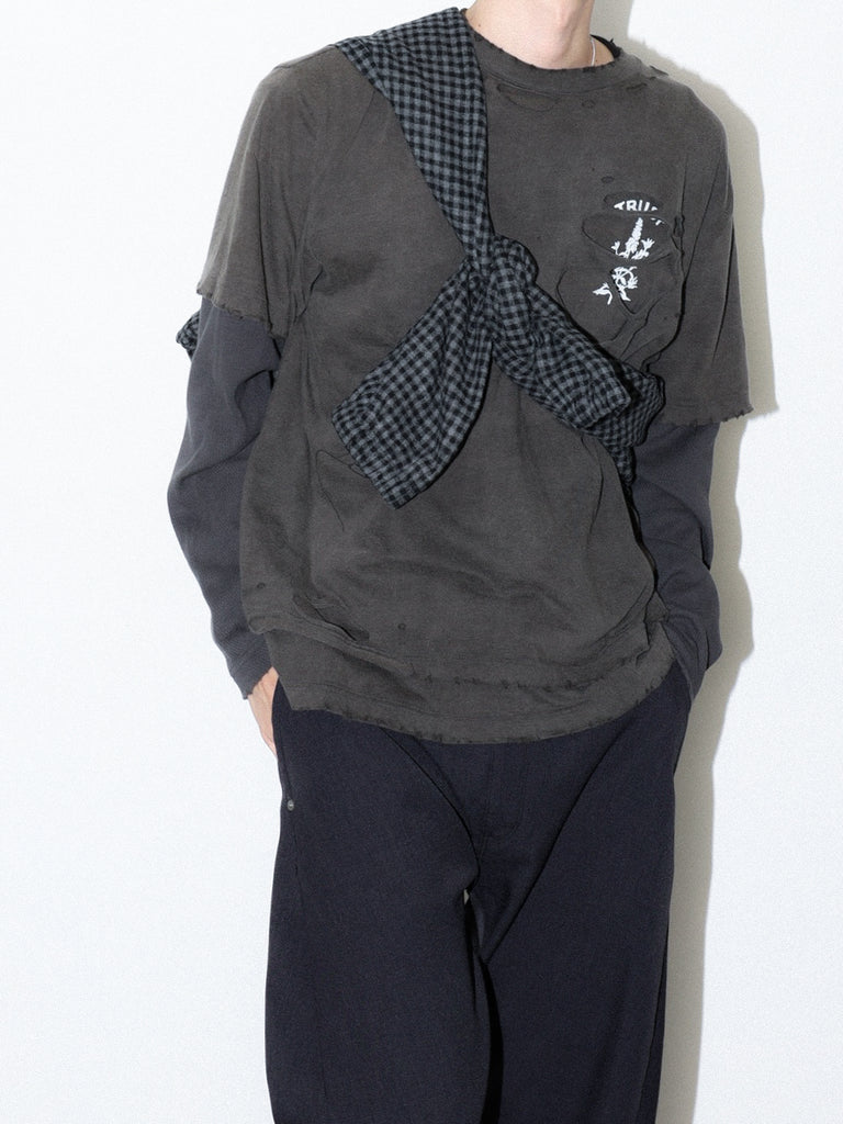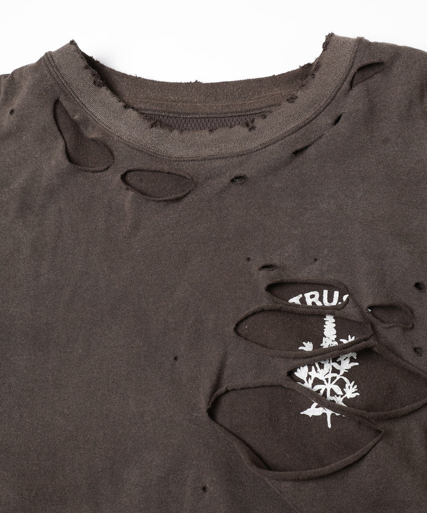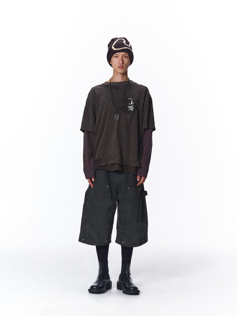 随所にあしらったダメージと左胸に配したプリントがアクセントとなっております。