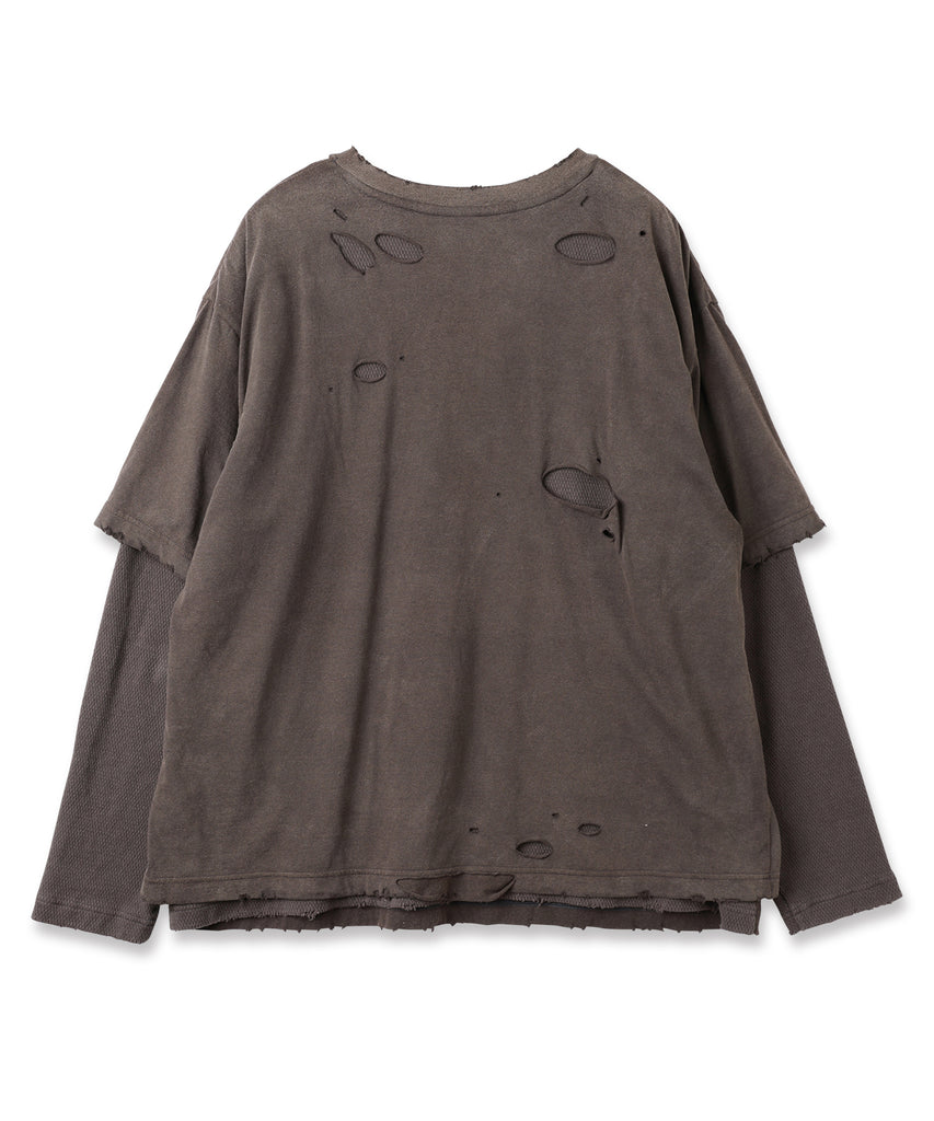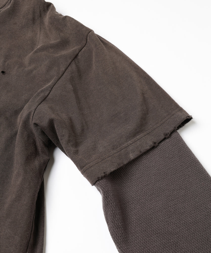 ピグメント加工を施した生地とスリーブや裾のワッフル生地のドッキングデザインが特徴的な1着。