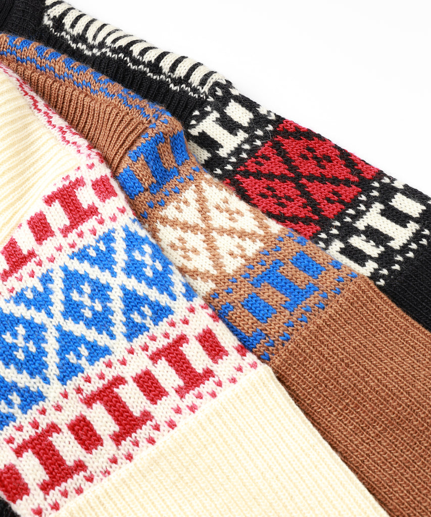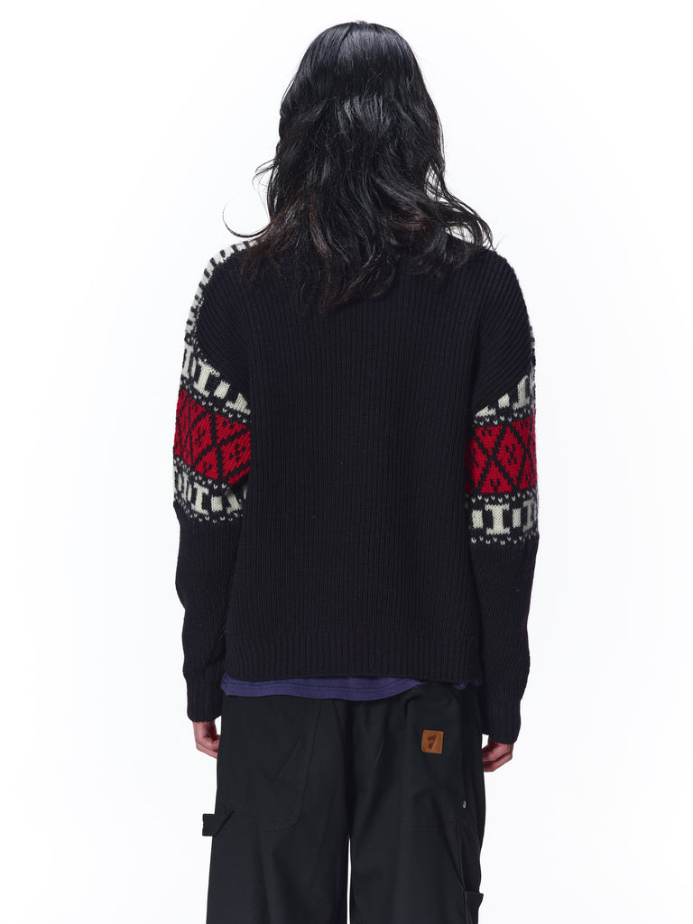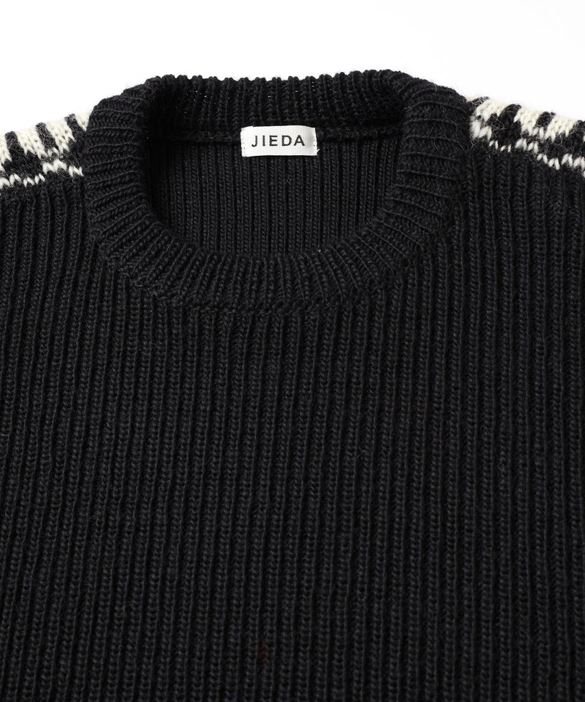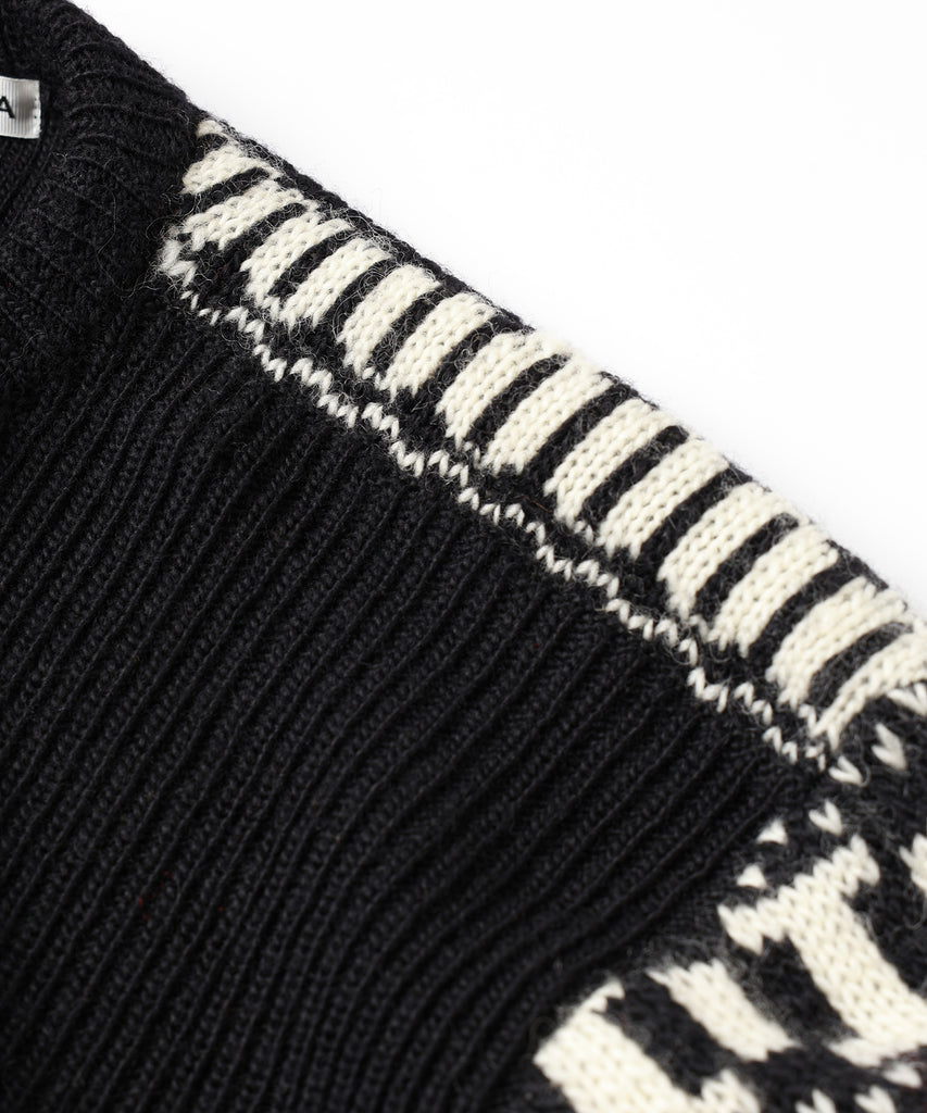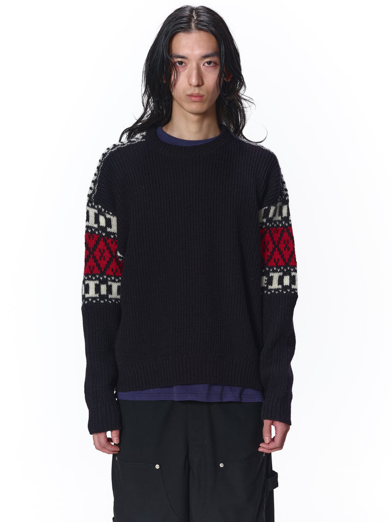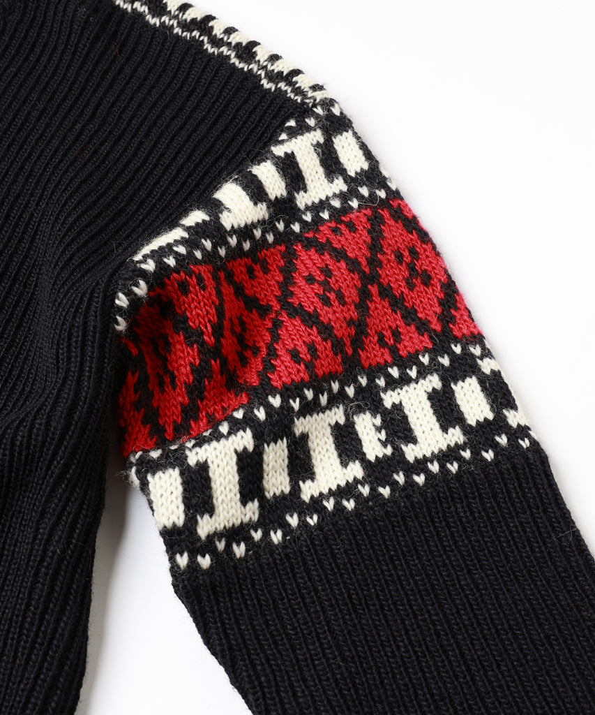 袖から肩にかけて北欧の伝統的なノルディック柄を使用した1着。